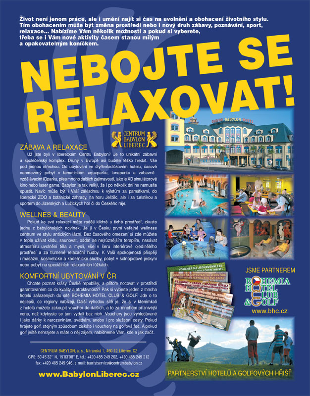 CENTRUM BABYLON, a. s., Nitranská 1, 460 12 Liberec, CZ GPS: 50°45‘32‘‘ N, 15°03‘08‘‘ E, tel.: +420 485 249 202, +420 485 249 212 fax: +420 485 249 946, e mail: touristservice@centrumbabylon.cz www.BabylonLiberec.cz