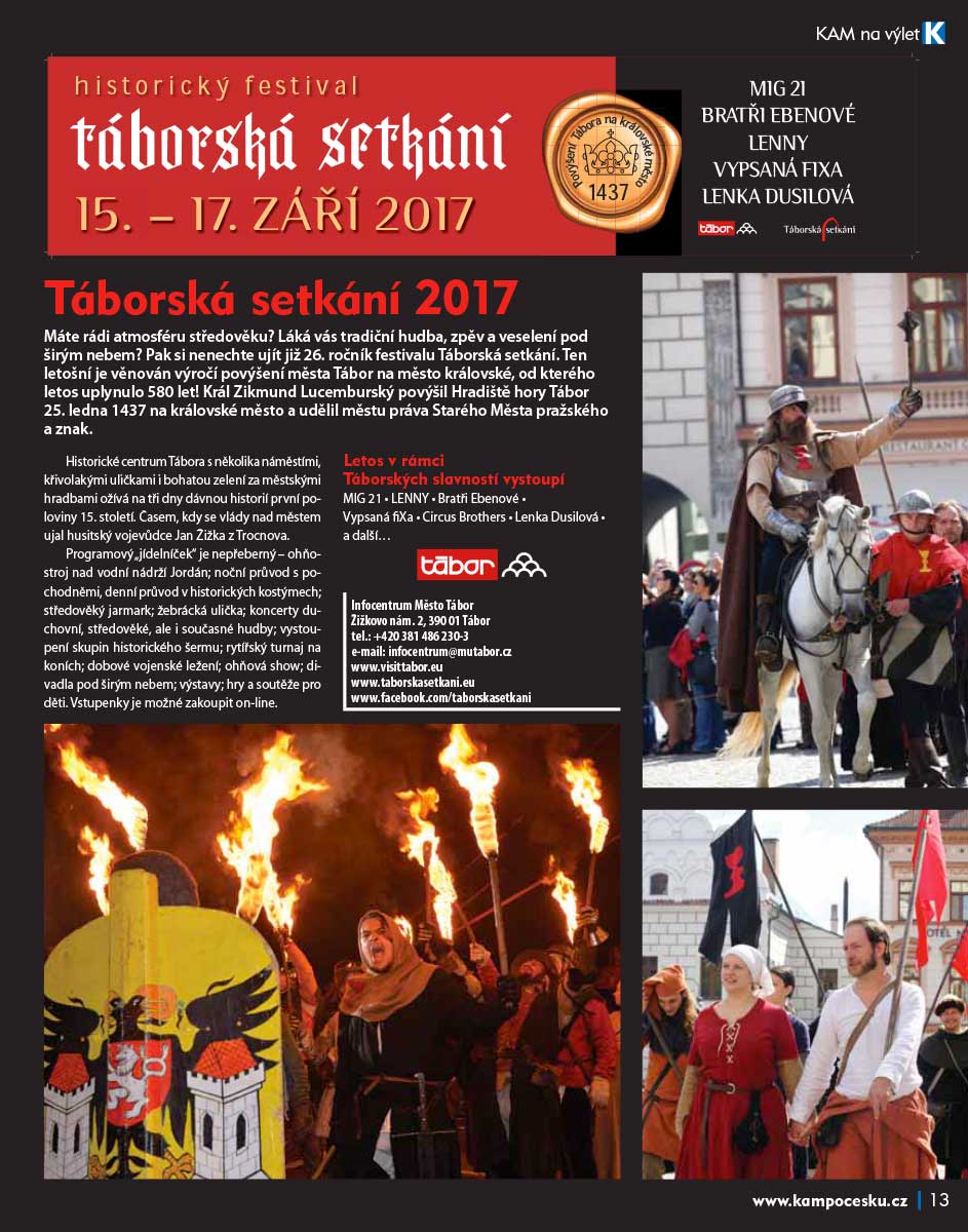 Historické centrum Tábora s několika náměstími, křivolakými uličkami i bohatou zelení za městskými hradbami ožívá na tři dny dávnou historií první poloviny 15. století. Časem, kdy se vlády nad městem ujal husitský vojevůdce Jan Žižka z Trocnova. Programový „jídelníček“ je nepřeberný – ohňostroj nad vodní nádrží Jordán; noční průvod s pochodněmi, denní průvod v historických kostýmech; středověký jarmark; žebrácká ulička; koncerty duchovní, středověké, ale i současné hudby; vystoupení skupin historického šermu; rytířský turnaj na koních; dobové vojenské ležení; ohňová show; divadla pod širým nebem; výstavy; hry a soutěže pro děti. Vstupenky je možné zakoupit on-line.