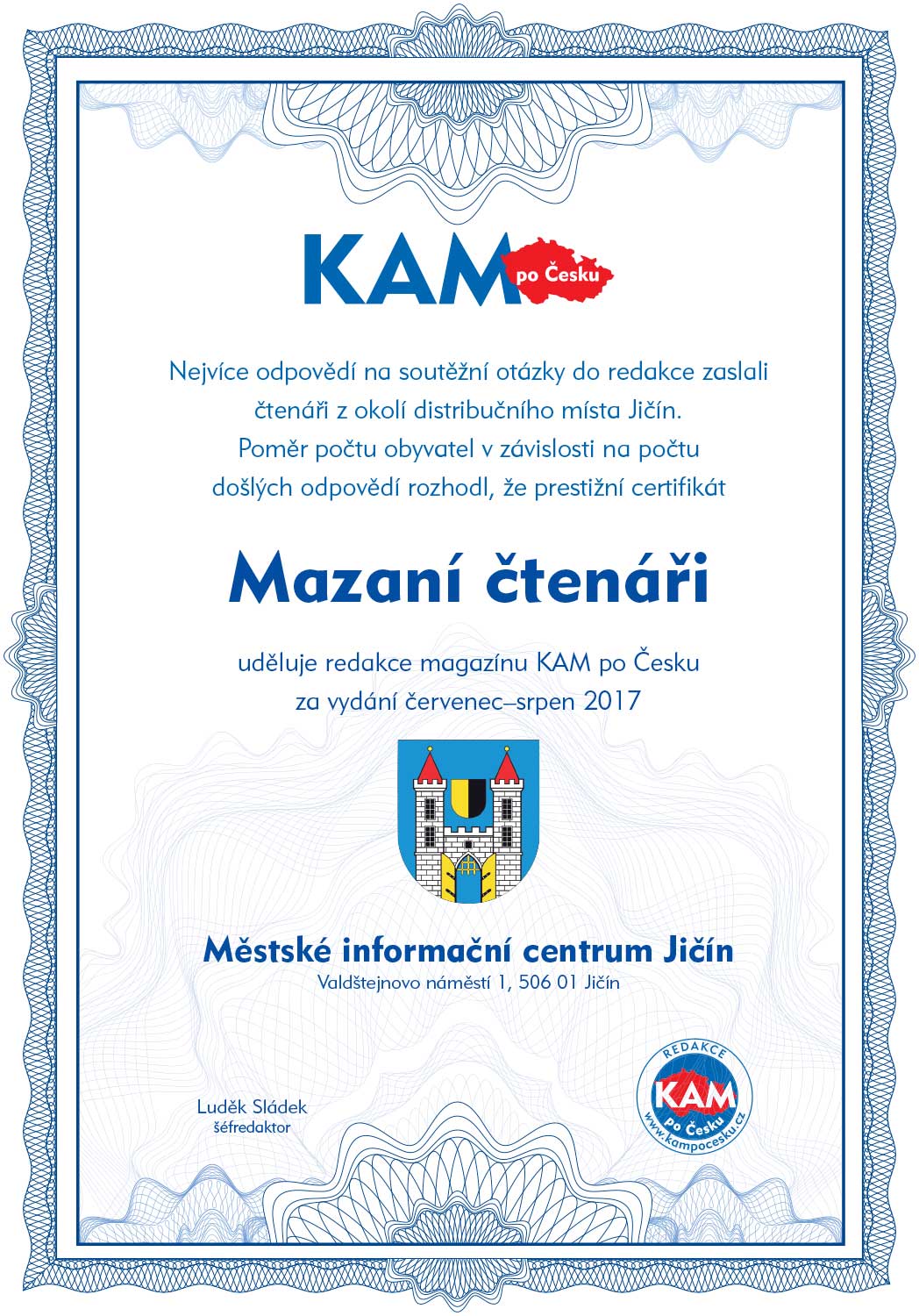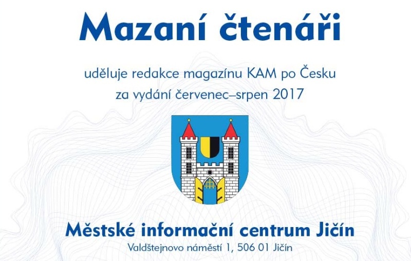 Nejvíce odpovědí na soutěžní otázky do redakce zaslali čtenáři z okolí distribučního místa Jičín. Poměr počtu obyvatel v závislosti na počtu došlých odpovědí rozhodl, že prestižní certifikát Mazaní čtenáři uděluje redakce magazínu KAM po Česku za vydání červenec–srpen 2017 Městské informační centrum Jičín   Valdštejnovo náměstí 1, 506 01 Jičín
