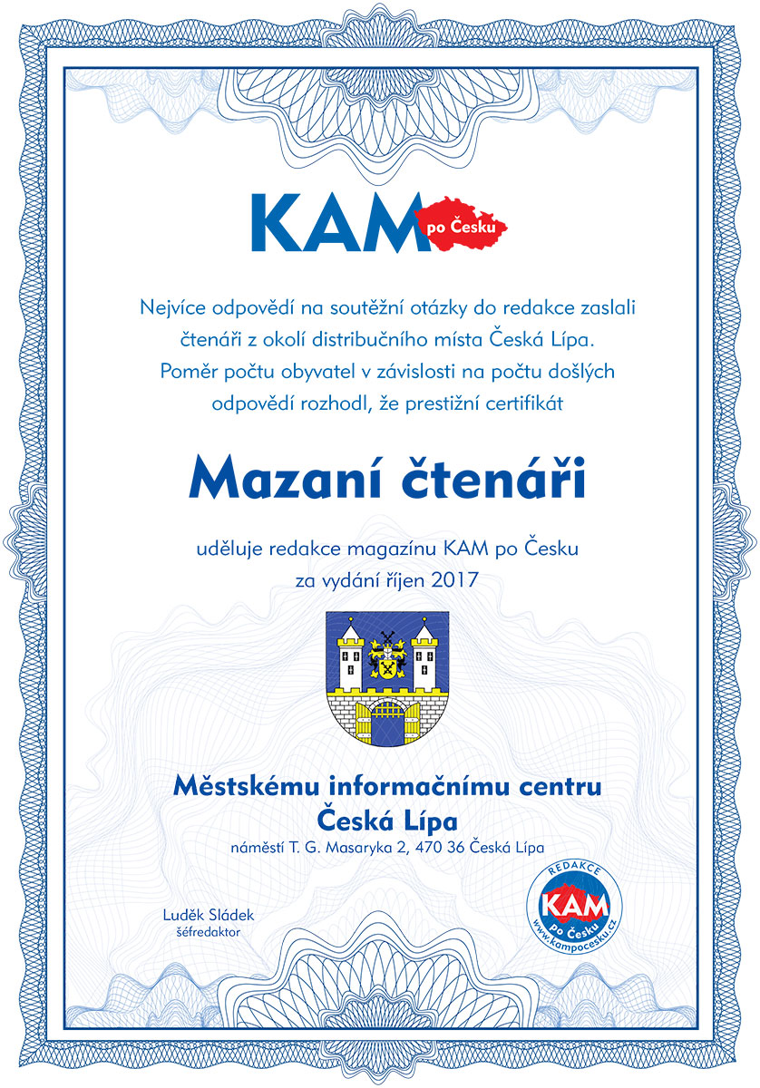 Nejvíce odpovědí na soutěžní otázky do redakce zaslali čtenáři z okolí distribučního místa Česká Lípa. Poměr počtu obyvatel v závislosti na počtu došlých odpovědí rozhodl, že prestižní certifikát Mazaní čtenáři uděluje redakce magazínu KAM po Česku za vydání říjen 2017