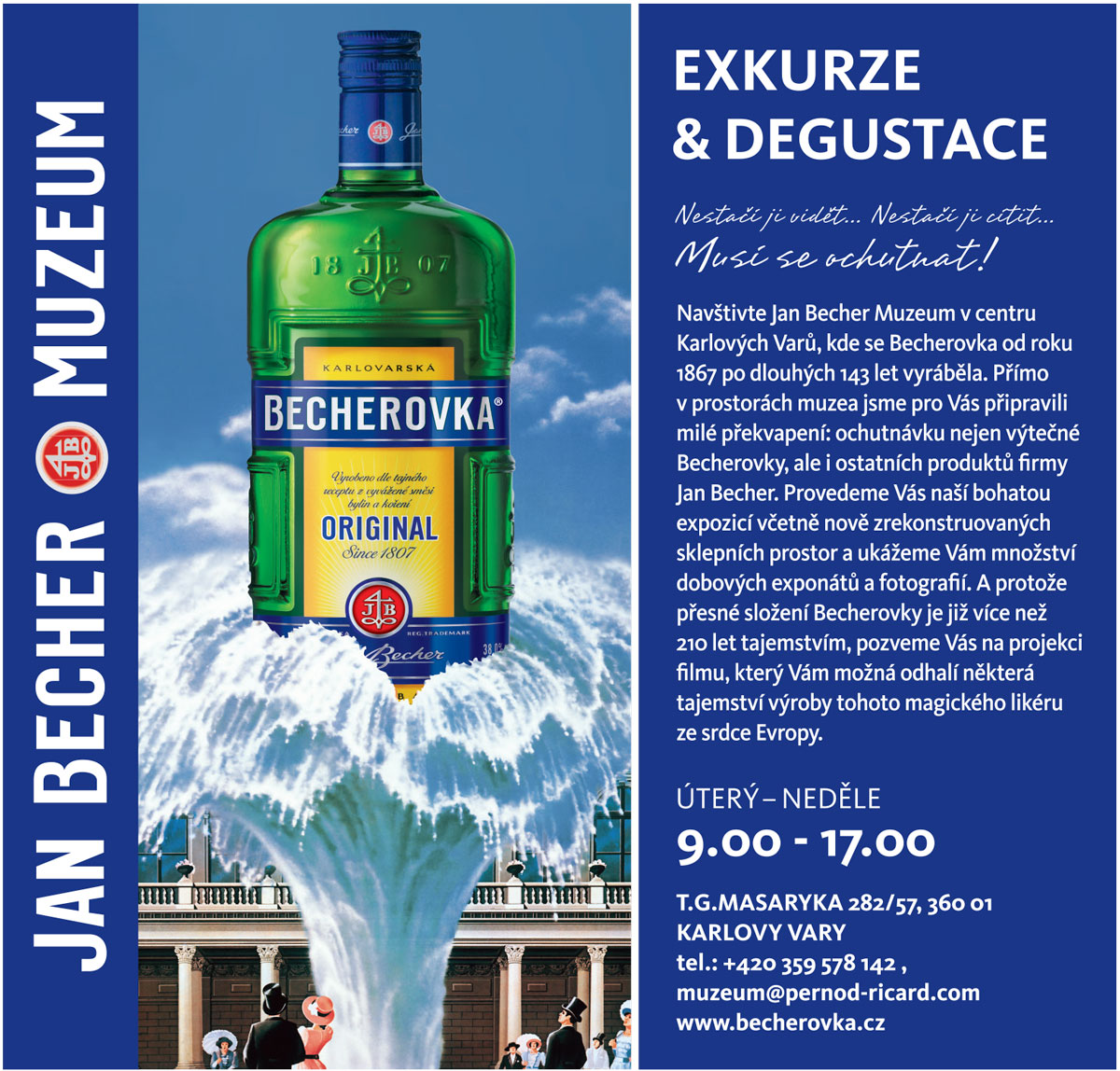 Navštivte Jan Becher Muzeum v centru Karlových Varů, kde se Becherovka od roku 1867 po dlouhých 143 let vyráběla. Přímo v prostorách muzea jsme pro Vás připravili milé překvapení: ochutnávku nejen výtečné Becherovky, ale i ostatních produktů firmy Jan Becher. Provedeme Vás naší bohatou expozicí včetně nově zrekonstruovaných sklepních prostora ukážeme Vám množství dobových exponátů a fotografií. A protože přesné složení Becherovky je již více než 210 let tajemstvím, pozveme Vás na projekci filmu, který Vám možná odhalí některá tajemství výroby tohoto magického likéru ze srdce Evropy.