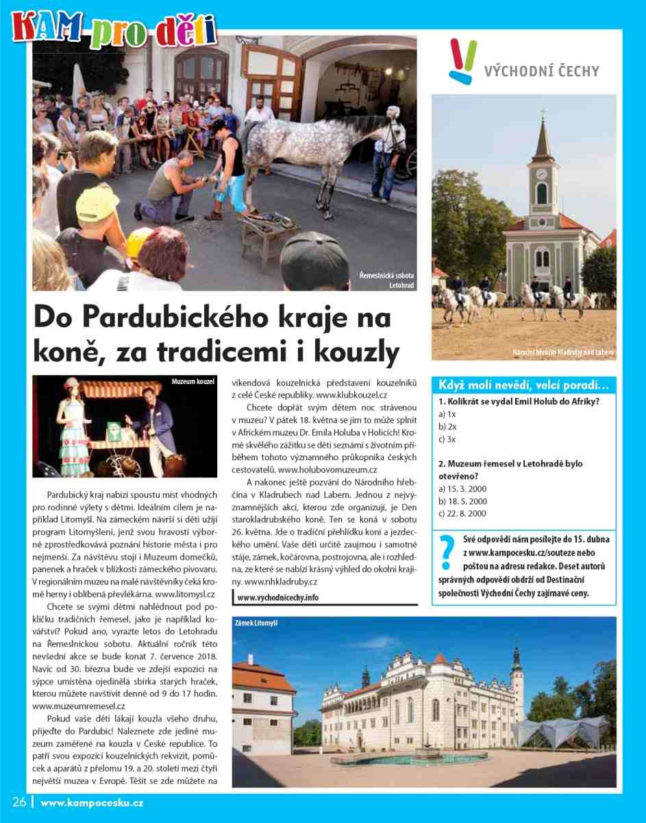 A nakonec ještě pozvání do Národního hřebčína v Kladrubech nad Labem. Jednou z nejvýznamnějších akcí, kterou zde organizují, je Den starokladrubského koně. Ten se koná v sobotu 26. května. Jde o tradiční přehlídku koní a jezdeckého umění. Vaše děti určitě zaujmou i samotné stáje, zámek, kočárovna, postrojovna, ale i rozhledna, ze které se nabízí krásný výhled do okolní krajiny. www.nhkladruby.cz