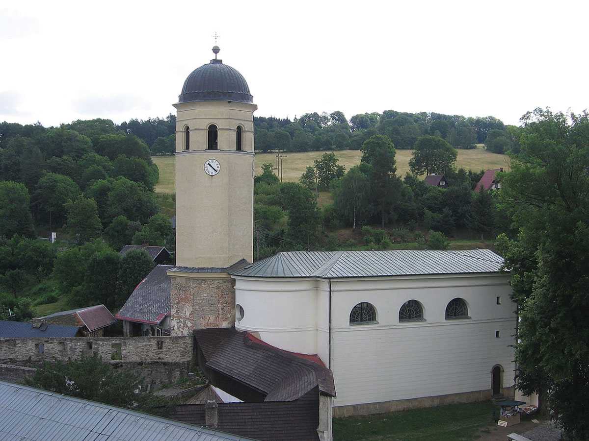foto © Wikimedia Commons, Pohled na hrad Sovinec z věže kostela