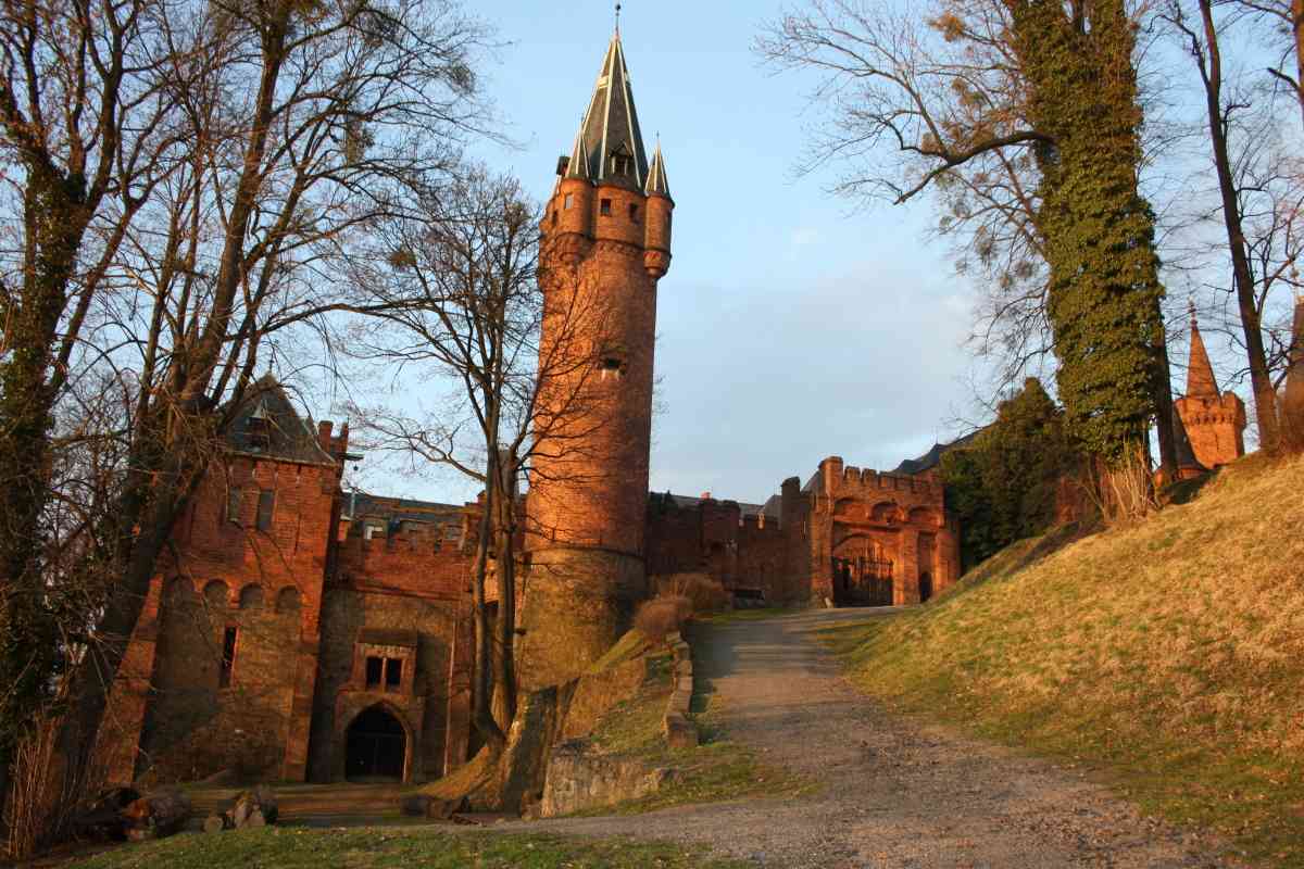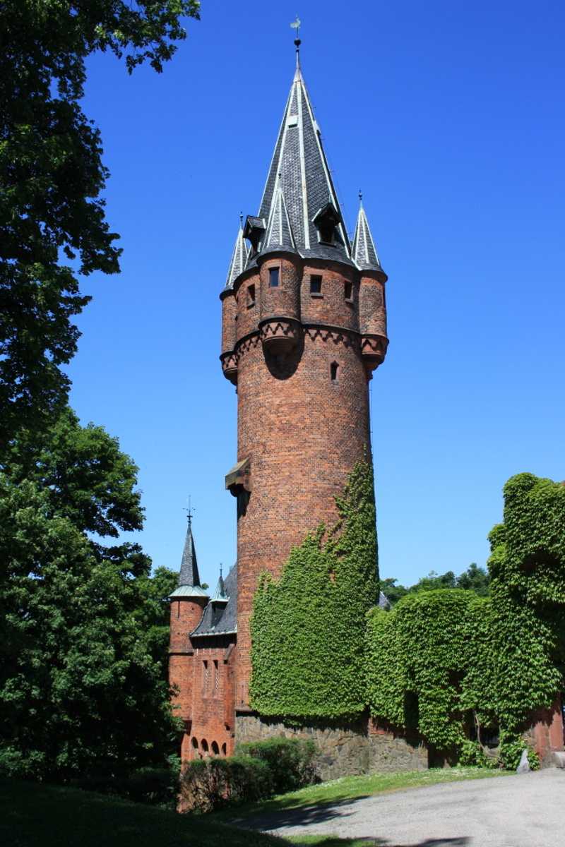 Tato věž nikdy neplnila funkci středověkých hradních pozorovatelen, byla dostavěna teprve v roce 1880 v rámci výstavby cihlového pseudogotického areálu Červeného zámku. Romantická věž láká četné návštěvníky, zejména děti. Od úrovně nádvoří je 35 m vysoká. Na její kuželovité věži se otáčí větrná korouhvička v podobě kohouta. Vnější průměr věže je 6 m. Až nad hodiny do ochozu vede 99 schodů se 2 odpočívadly.