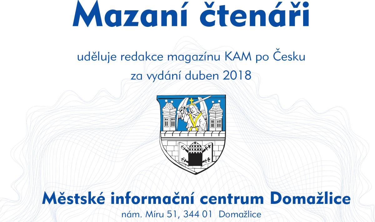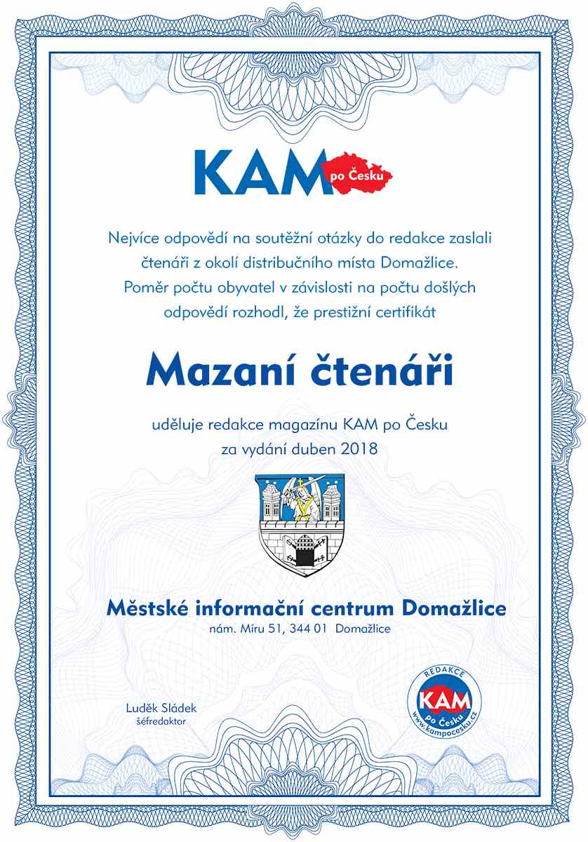 Nejvíce odpovědí na soutěžní otázky do redakce zaslali čtenáři z okolí distribučního místa Domažlice. Poměr počtu obyvatel v závislosti na počtu došlých odpovědí rozhodl, že prestižní certifikát Mazaní čtenáři uděluje redakce magazínu KAM po Česku za vydání Duben 2018 Městské informační centrum Domažlice, nám. Míru 51, 344 01 Domažlice