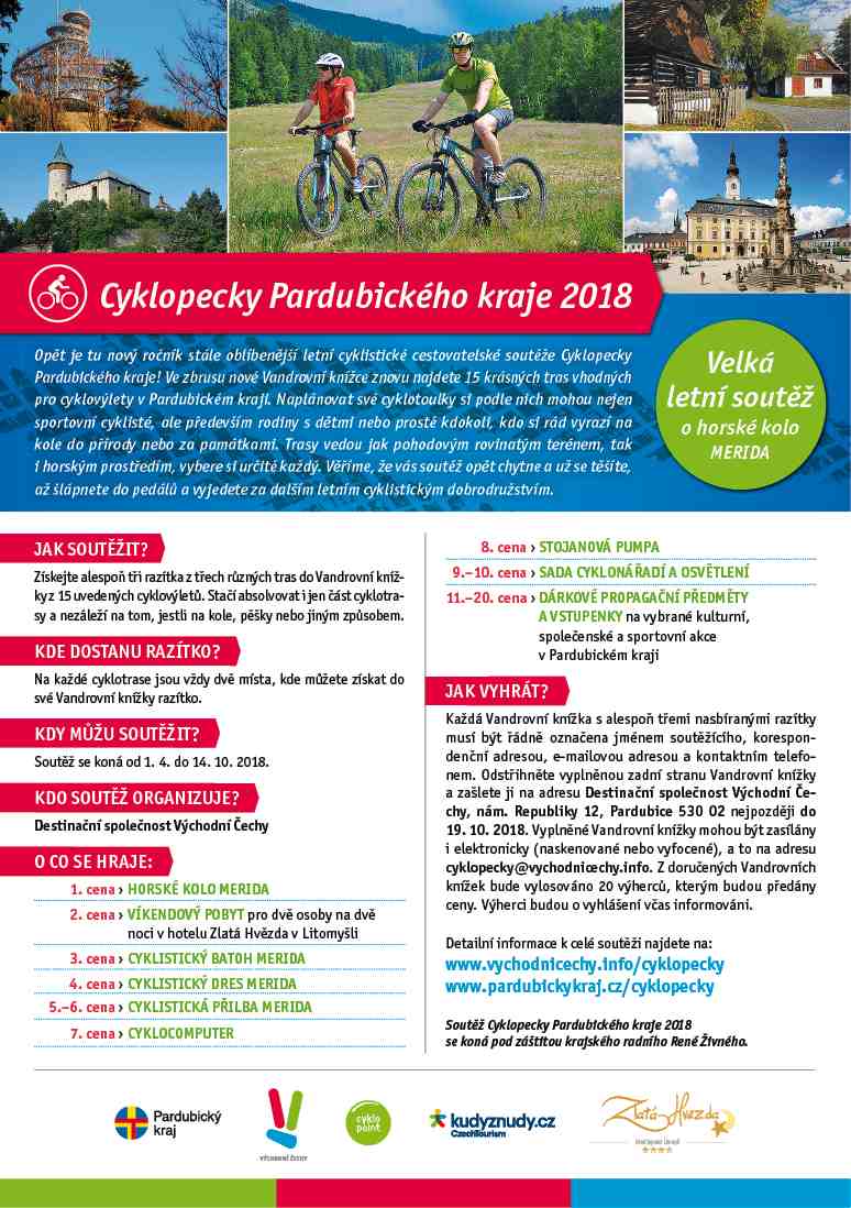 Těšit se můžete například na další ročník zajímavých cestovatelských soutěží. I v letošním roce se tak budete moci nechat inspirovat atraktivními tipy na cyklistické výlety prostřednictvím soutěže Cyklopecky Pardubického kraje 2018.