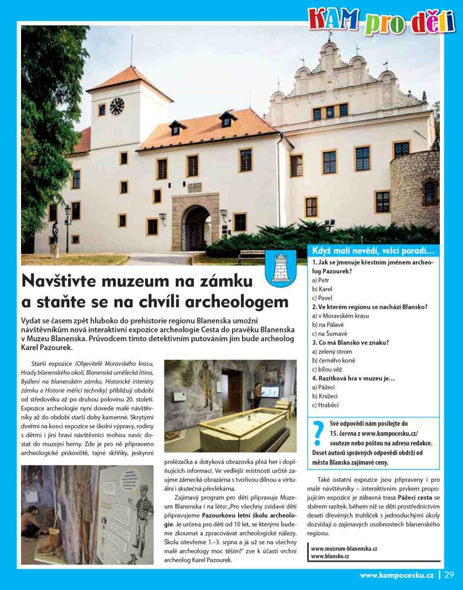 Zajímavý program pro děti připravuje Muzeum Blanenska i na léto: „Pro všechny zvídavé děti připravujeme Pazourkovu letní školu archeologie. Je určena pro děti od 10 let, se kterými budeme zkoumat a zpracovávat archeologické nálezy. Školu otevřeme 1.–3. srpna a já už se na všechny malé archeology moc těším!“ zve k účasti vrchní archeolog Karel Pazourek.