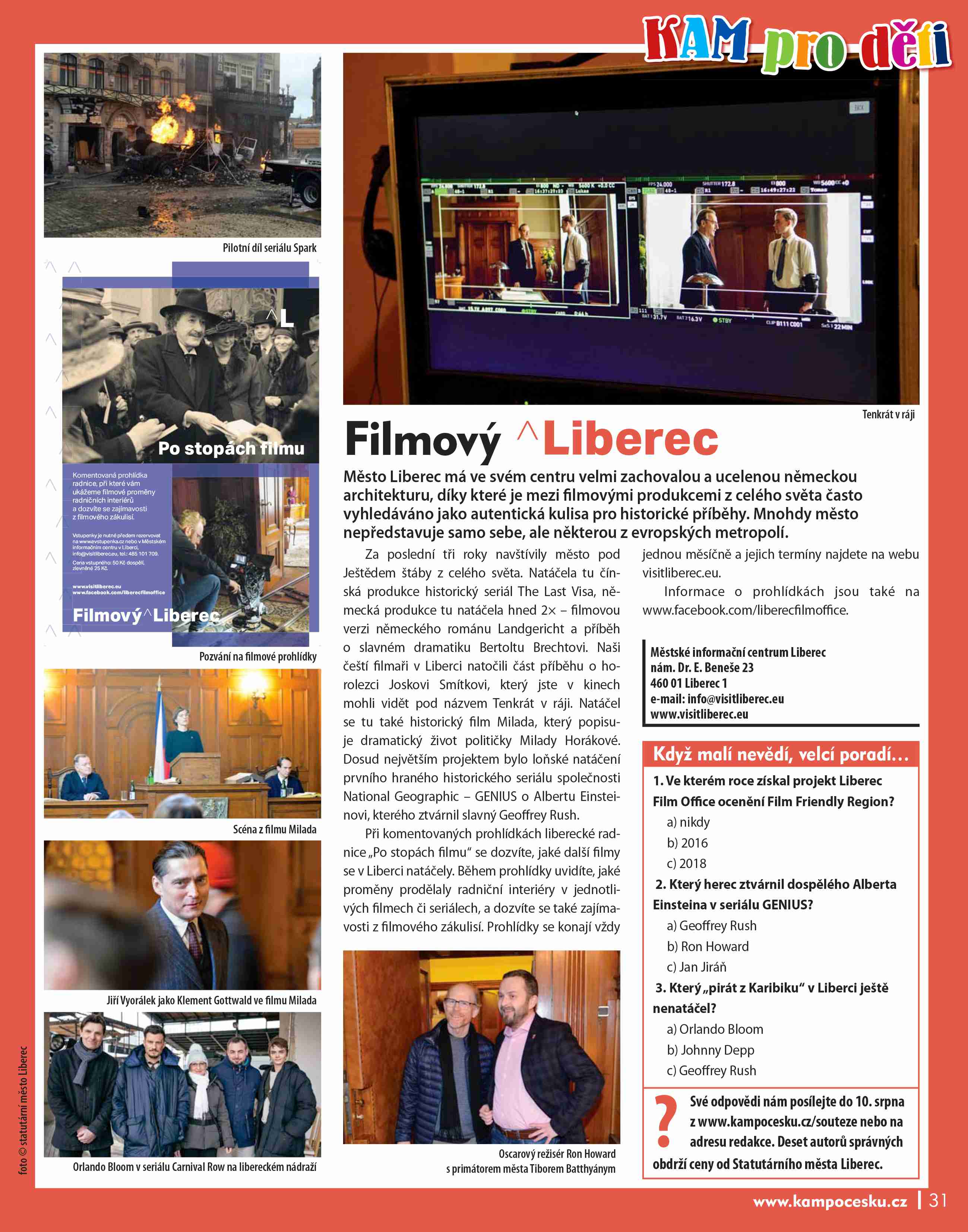 Při komentovaných prohlídkách liberecké radnice „Po stopách filmu“ se dozvíte, jaké další filmy se v Liberci natáčely. Během prohlídky uvidíte, jaké proměny prodělaly radniční interiéry v jednotlivých fi lmech či seriálech, a dozvíte se také zajímavosti z filmového zákulisí. Prohlídky se konají vždy jednou měsíčně a jejich termíny najdete na webu visitliberec.eu.