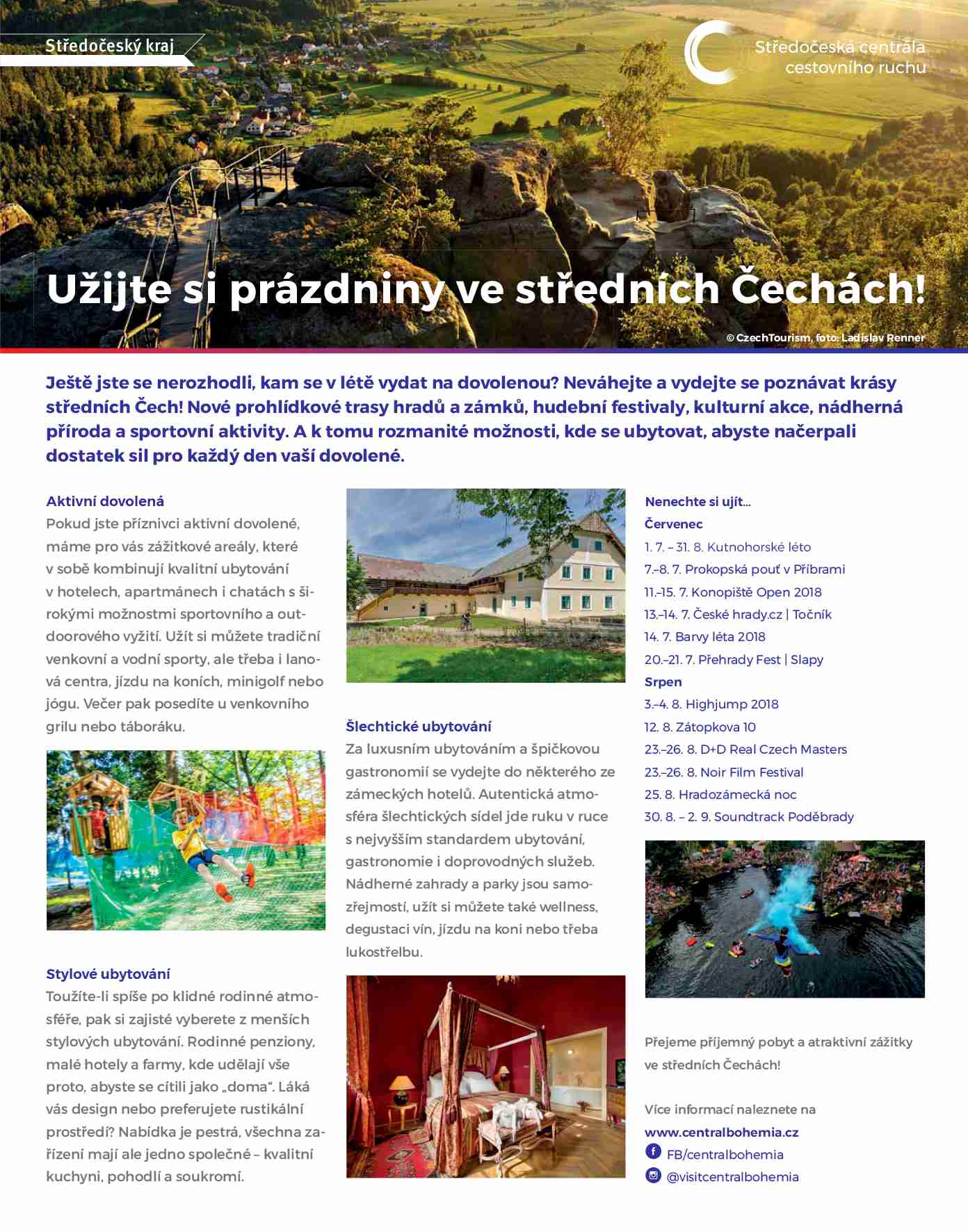 Ještě jste se nerozhodli, kam se v létě vydat na dovolenou? Neváhejte a vydejte se poznávat krásy středních Čech! Nové prohlídkové trasy hradů a zámků, hudební festivaly, kulturní akce, nádherná příroda a sportovní aktivity. A k tomu rozmanité možnosti, kde se ubytovat, abyste načerpali dostatek sil pro každý den vaší dovolené.