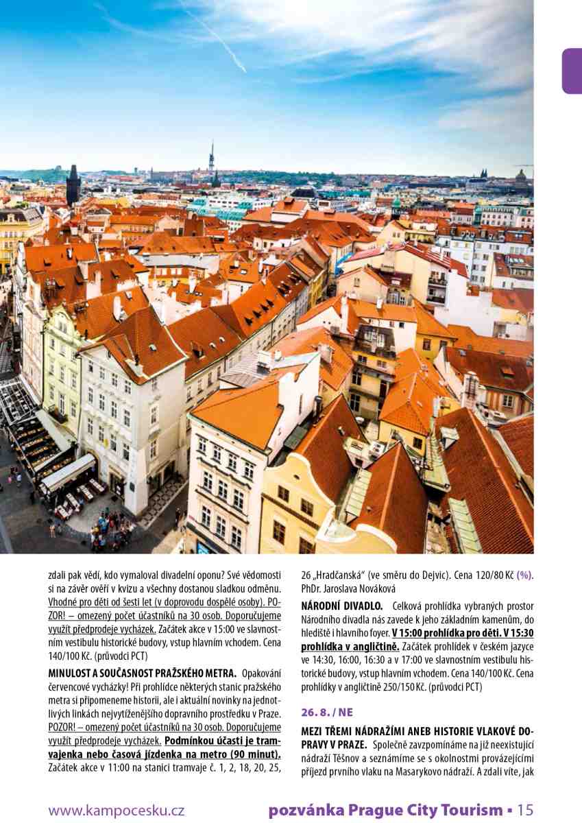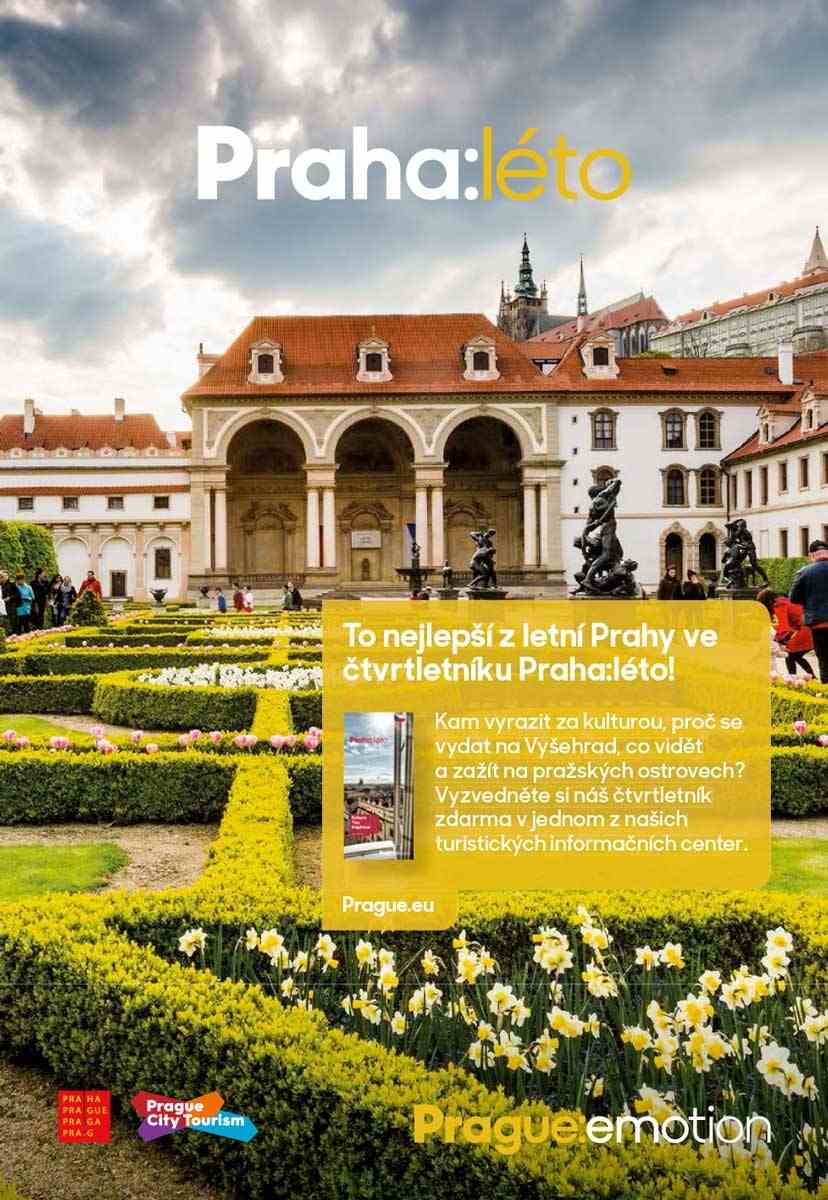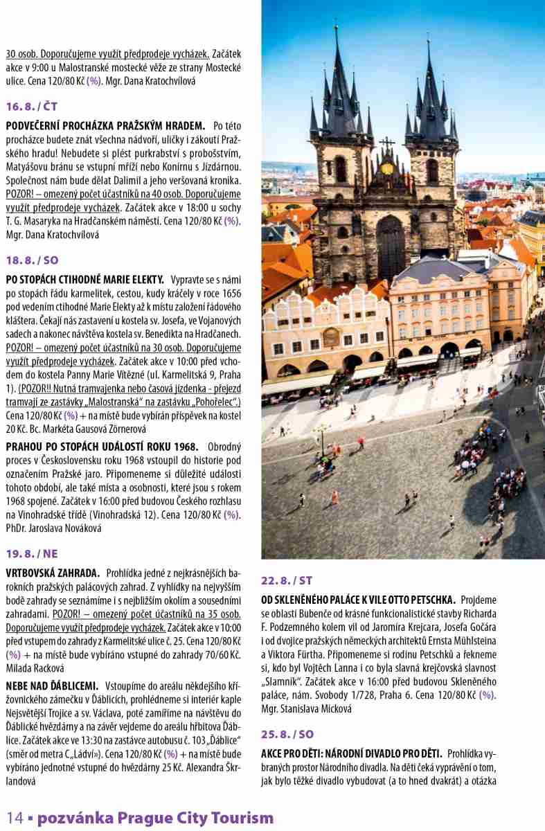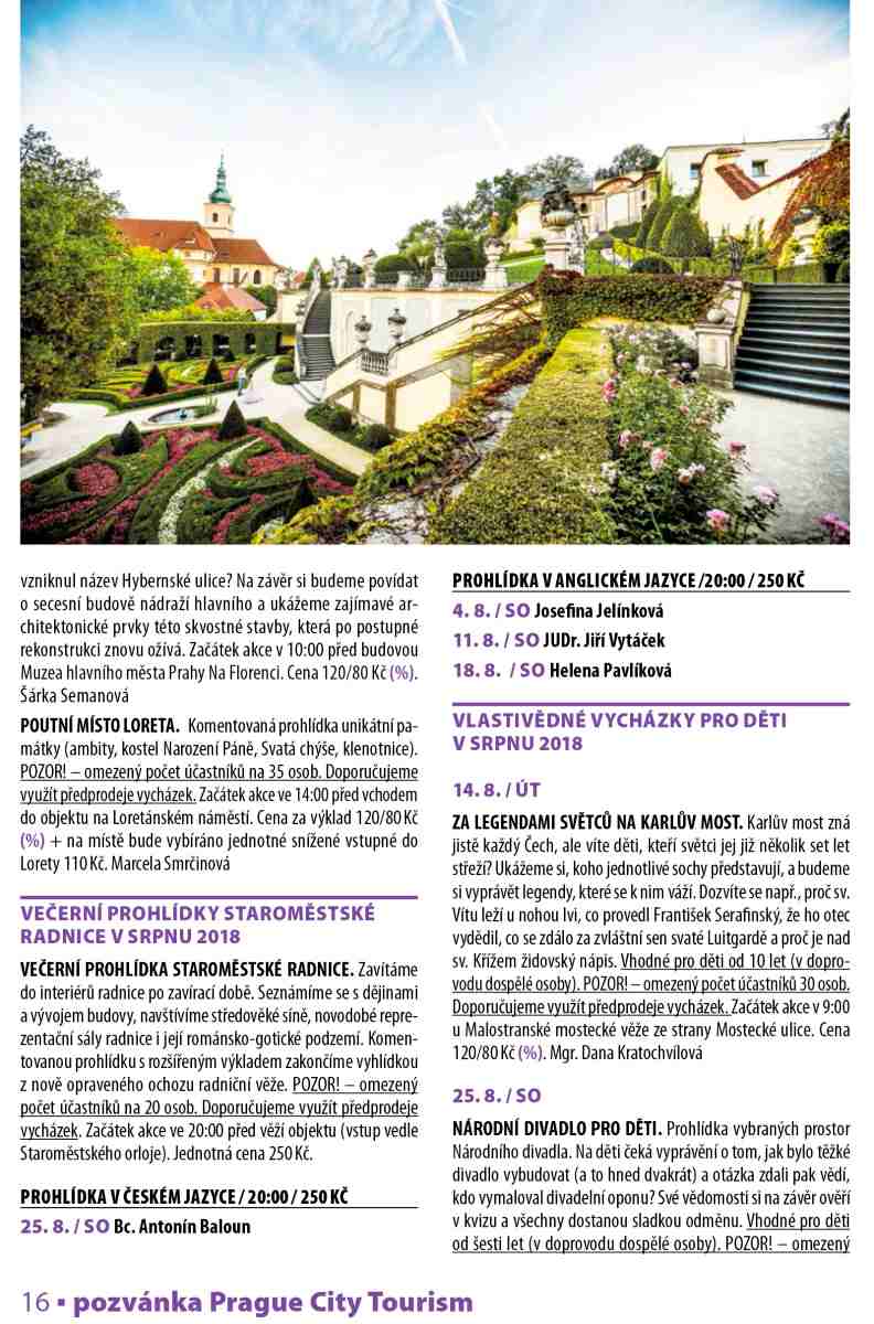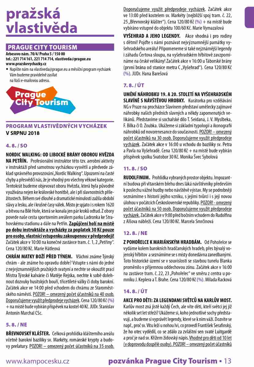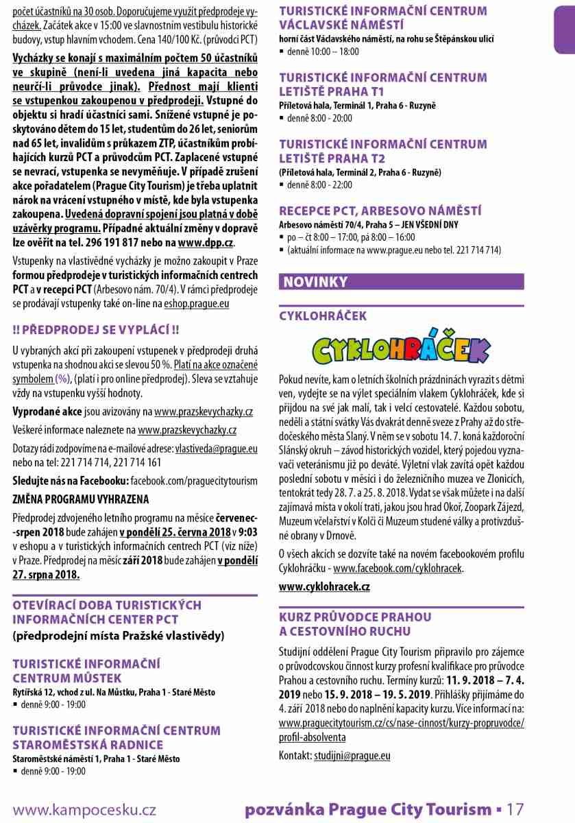 U vybraných akcí při zakoupení vstupenek v předprodeji druhá vstupenka na shodnou akci se slevou 50 %. Platí na akce označené symbolem (%), (platí i pro online předprodej). Sleva se vztahuje vždy na vstupenku vyšší hodnoty. Vyprodané akce jsou avizovány na www.prazskevychazky.cz Veškeré informace naleznete na www.prazskevychazky.cz Dotazy rádi zodpovíme na e-mailové adrese: vlastiveda@prague.eu nebo na tel: 221 714 714, 221 714 161 Sledujte nás na Facebooku: facebook.com/praguecitytourism ZMĚNA PROGRAMU VYHRAZENA Předprodej zdvojeného letního programu na měsíce červenec- -srpen 2018 bude zahájen v pondělí 25. června 2018 v 9:03 v eshopu a v turistických informačních centrech PCT (viz níže) v Praze. Předprodej na měsíc září 2018 bude zahájen v pondělí 27. srpna 2018.