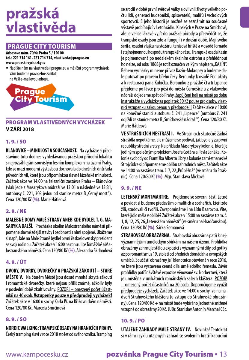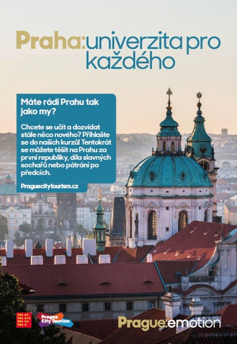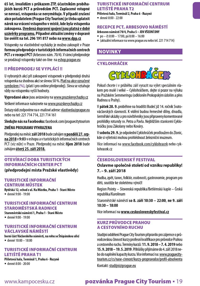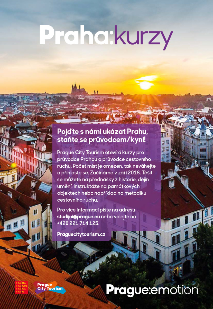 Studijní oddělení Prague City Tourism připravilo pro zájemce o průvodcovskou činnost kurzy profesní kvalifikace pro průvodce Prahou a cestovního ruchu. Termíny kurzů: 11. 9. 2018 – 7. 4. 2019 nebo 15. 9. 2018 – 19. 5. 2019. Přihlášky přijímáme do 4. září 2018 nebo do naplnění kapacity kurzu. Více informací na: www.praguecitytourism.cz/cs/nase-cinnost/kurzy-propruvodce/profil-absolventa