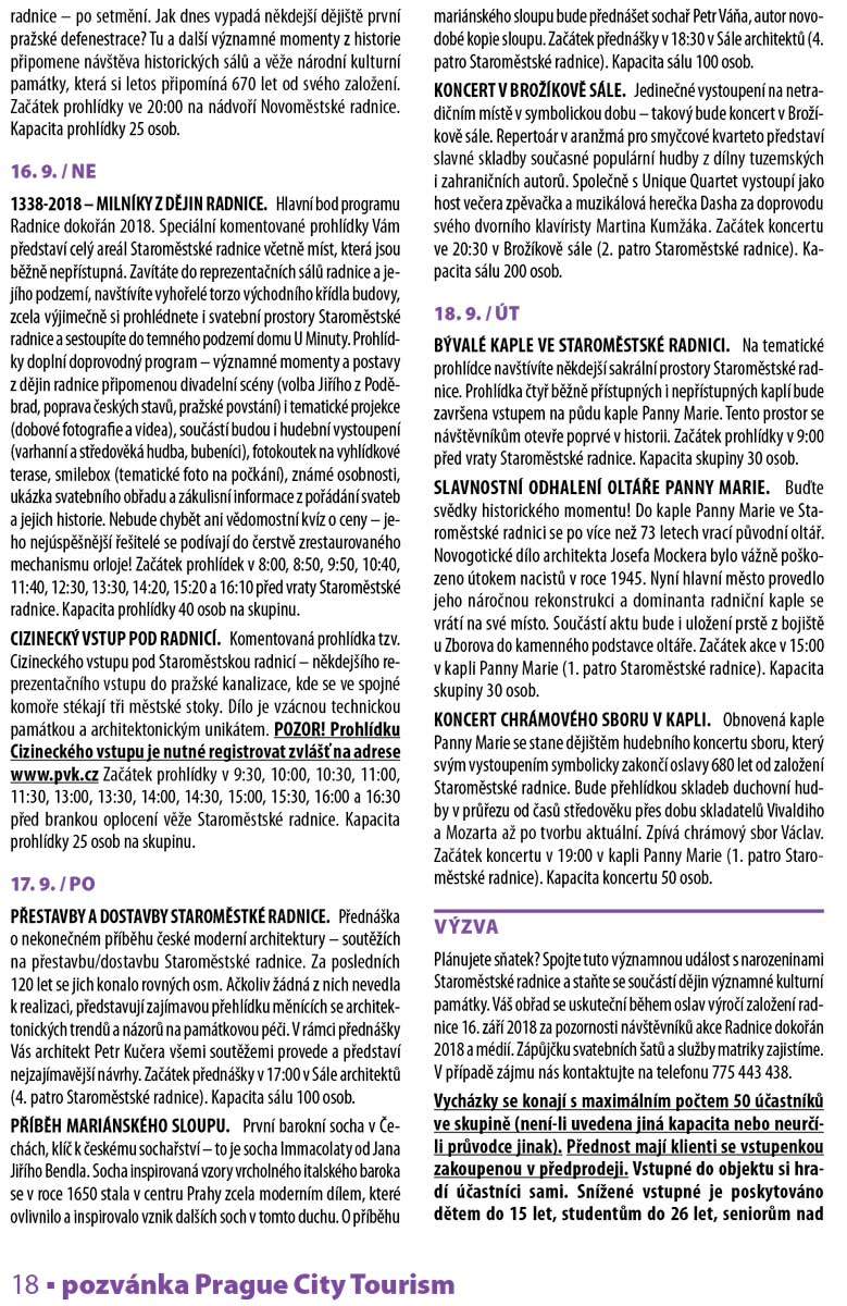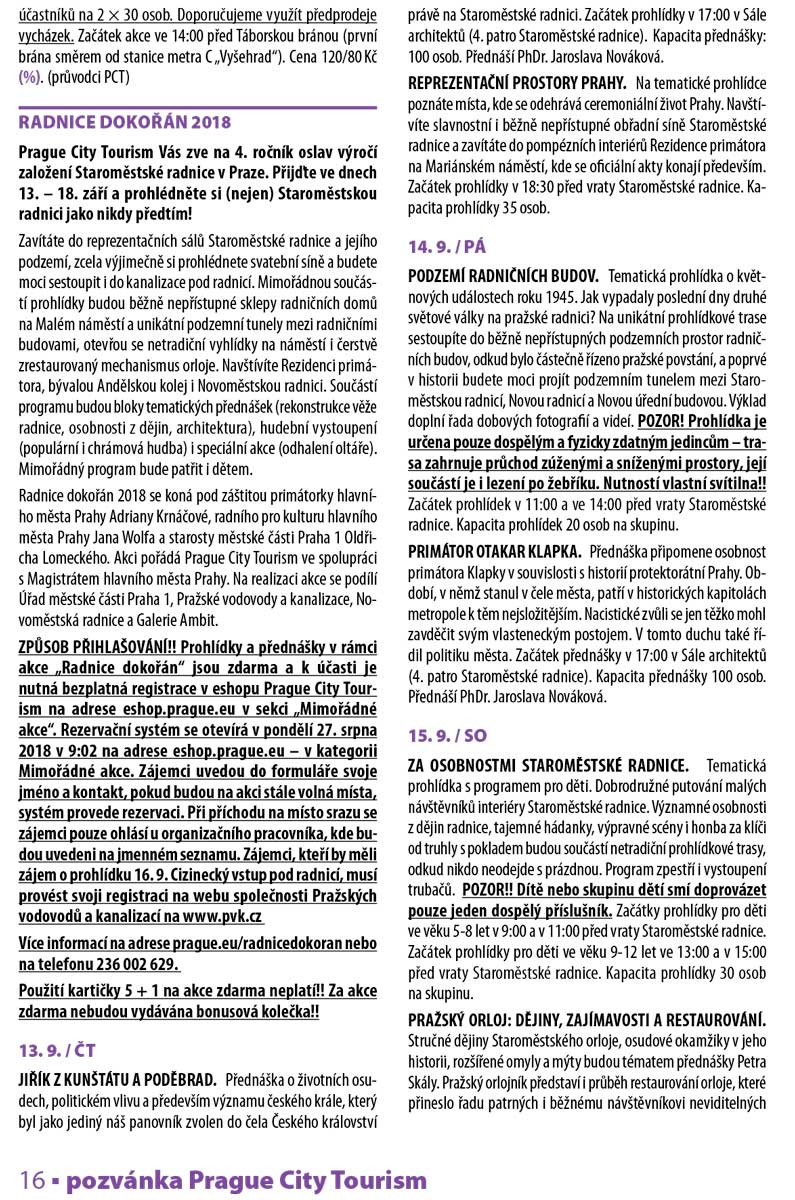 ZPŮSOB PŘIHLAŠOVÁNÍ!! Prohlídky a přednášky v rámci akce „Radnice dokořán“ jsou zdarma a k účasti je nutná bezplatná registrace v eshopu Prague City Tourism na adrese eshop.prague.eu v sekci „Mimořádné akce“. Rezervační systém se otevírá v pondělí 27. srpna 2018 v 9:02 na adrese eshop.prague.eu – v kategorii Mimořádné akce. Zájemci uvedou do formuláře svoje jméno a kontakt, pokud budou na akci stále volná místa, systém provede rezervaci. Při příchodu na místo srazu se zájemci pouze ohlásí u organizačního pracovníka, kde budou uvedeni na jmenném seznamu. Zájemci, kteří by měli zájem o prohlídku 16. 9. Cizinecký vstup pod radnicí, musí provést svoji registraci na webu společnosti Pražských vodovodů a kanalizací na www.pvk.cz