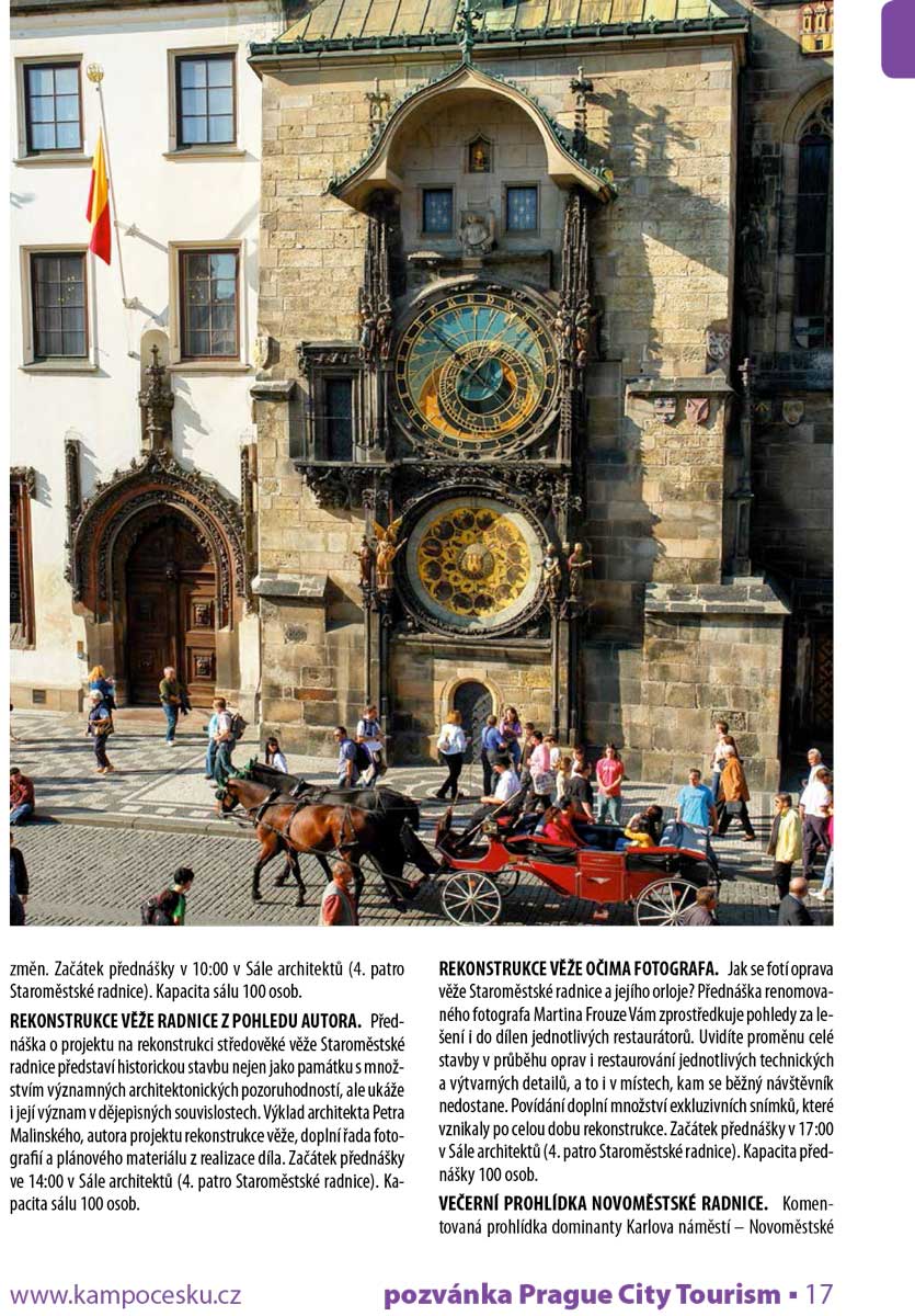 REKONSTRUKCE VĚŽE RADNICE Z POHLEDU AUTORA. Přednáška o projektu na rekonstrukci středověké věže Staroměstské radnice představí historickou stavbu nejen jako památku s množstvím významných architektonických pozoruhodností, ale ukáže i její význam v dějepisných souvislostech. Výklad architekta Petra Malinského, autora projektu rekonstrukce věže, doplní řada fotografií a plánového materiálu z realizace díla. Začátek přednášky ve 14:00 v Sále architektů (4. patro Staroměstské radnice). Kapacita sálu 100 osob.