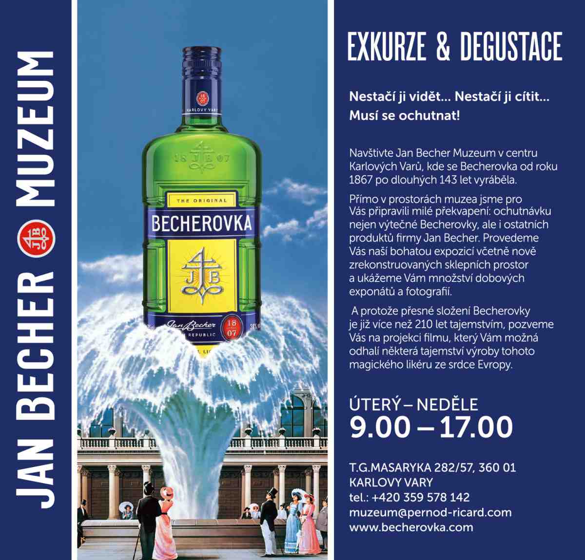 Navštivte Jan Becher Muzeum v centru Karlových Varů, kde se Becherovka od roku 1867 po dlouhých 143 let vyráběla. Přímo v prostorách muzea jsme pro Vás připravili milé překvapení: ochutnávku nejen výtečné Becherovky, ale i ostatních produktů firmy Jan Becher. Provedeme Vás naší bohatou expozicí včetně nově zrekonstruovaných sklepních prostora ukážeme Vám množství dobových exponátů a fotografií. A protože přesné složení Becherovky je již více než 210 let tajemstvím, pozveme Vás na projekci filmu, který Vám možná odhalí některá tajemství výroby tohoto magického likéru ze srdce Evropy.