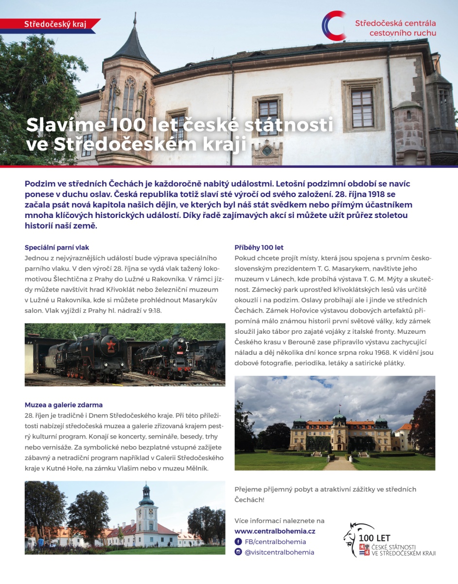Podzim ve středních Čechách je každoročně nabitý událostmi. Letošní podzimní období se navíc ponese v duchu oslav. Česká republika totiž slaví sté výročí od svého založení. 28. října 1918 se začala psát nová kapitola našich dějin, ve kterých byl náš stát svědkem nebo přímým účastníkem mnoha klíčových historických událostí. Díky řadě zajímavých akcí si můžete užít průřez stoletou historií naší země.