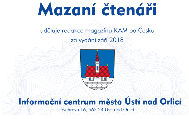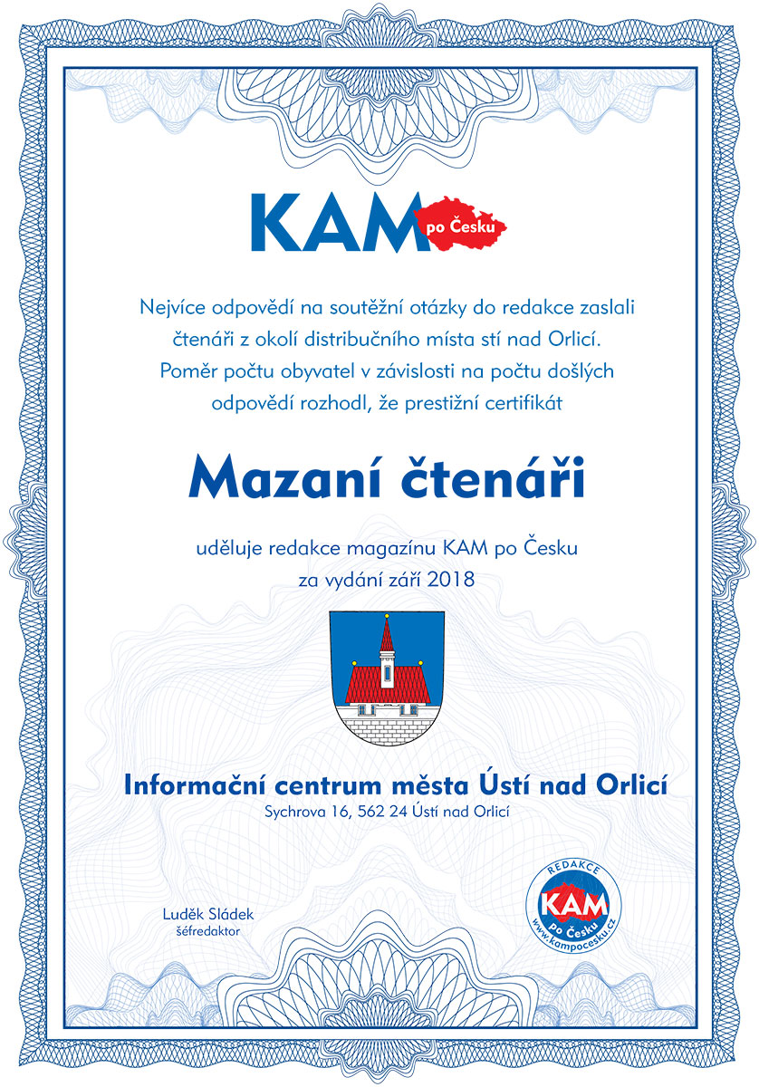 Nejvíce odpovědí na soutěžní otázky do redakce zaslali čtenáři z okolí distribučního místa stí nad Orlicí. Poměr počtu obyvatel v závislosti na počtu došlých odpovědí rozhodl, že prestižní certifikát Mazaní čtenáři uděluje redakce magazínu KAM po Česku za vydání září 2018 Informační centrum města Ústí nad Orlicí, Sychrova 16, 562 24 Ústí nad Orlicí