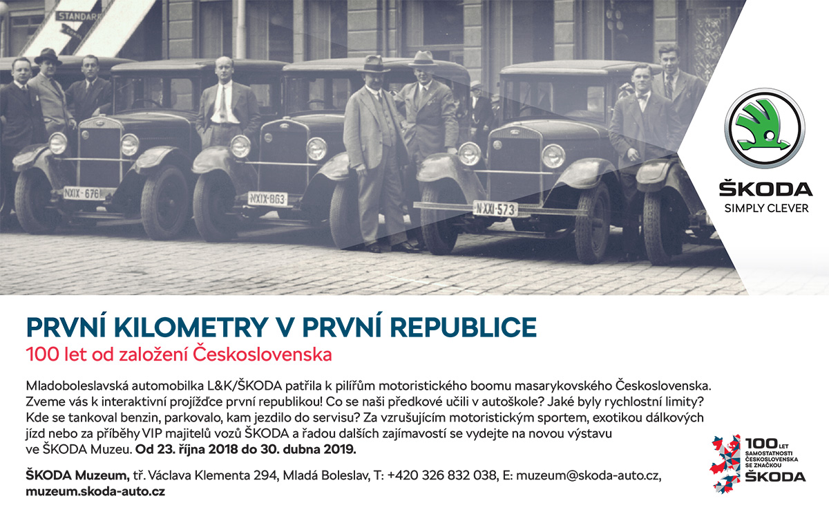 Mladoboleslavská automobilka L&K/ŠKODA patřila k pilířům motoristického boomu masarykovského Československa. Zveme vás k interaktivní projížďce první republikou! Co se naši předkové učili v autoškole? Jaké byly rychlostní limity? Kde se tankoval benzin, parkovalo, kam jezdilo do servisu? Za vzrušujícím motoristickým sportem, exotikou dálkových jízd nebo za příběhy VIP majitelů vozů ŠKODA a řadou dalších zajímavostí se vydejte na novou výstavu ve ŠKODA Muzeu. Od 23. října 2018 do 30. dubna 2019.