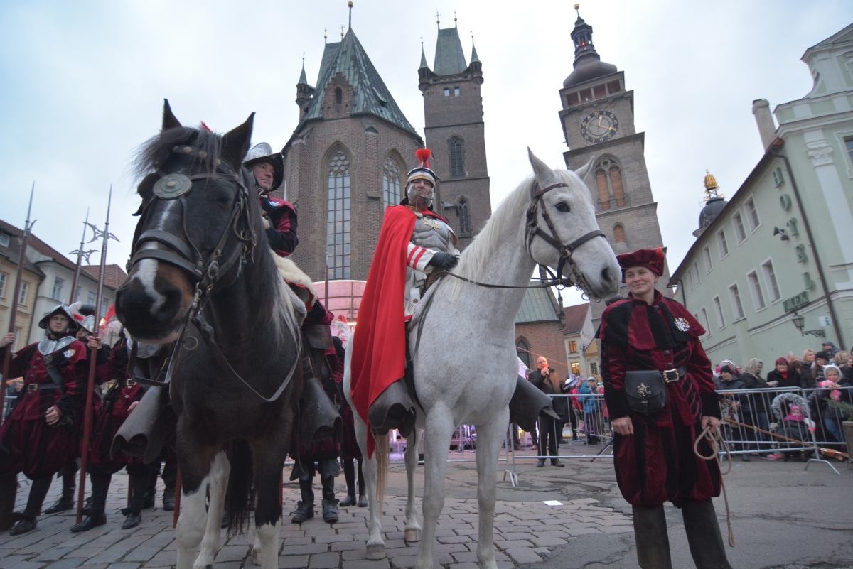 Bílý kůň coby symbol přicházející zimní turistické sezony doveze ve tři hodiny Martina pod Bílou věž v Hradci Králové.