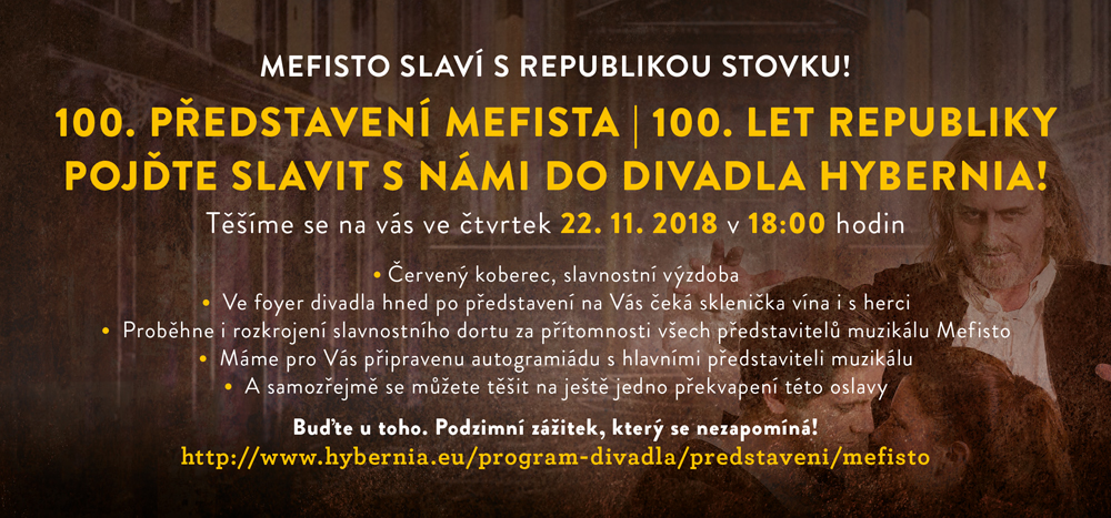 22. 11. od 18 hodin se uskuteční v Divadle Hybernia 100. představení muzikálu Mefisto!