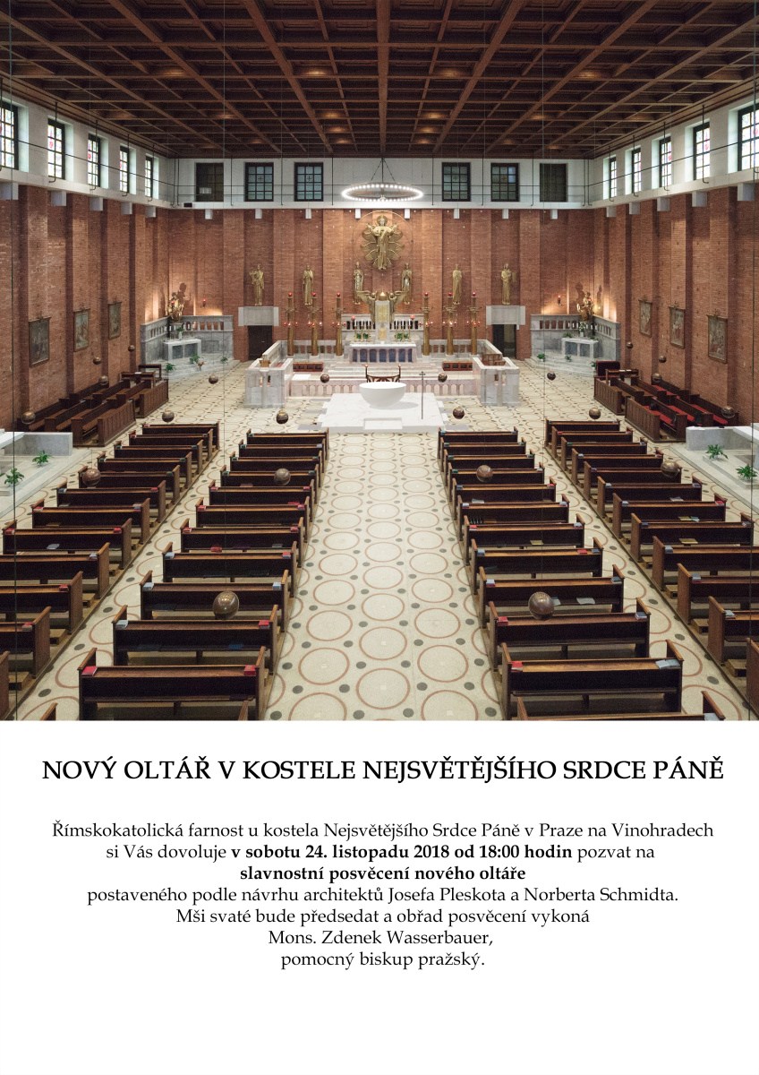 V kostele Nejsvětějšího Srdce Páně na náměstí Jiřího z Poděbrad od architekta Josipa Plečnika byl 14. listopadu 2018 instalován nový oltář od architektů Josefa Pleskota a Norberta Schmidta. Slavnostní posvěcení proběhne v sobotu 24. listopadu. Objekt má tvar rozpůleného oválu a bude se jakoby vznášet na podiu v čele kostela. Byl zhotoven z bílého carrarského mramoru a nahradil původní z roku 1992, který byl koncipován ve své době už jako provizorní. Zaplacen byl ze zdrojů farnosti.