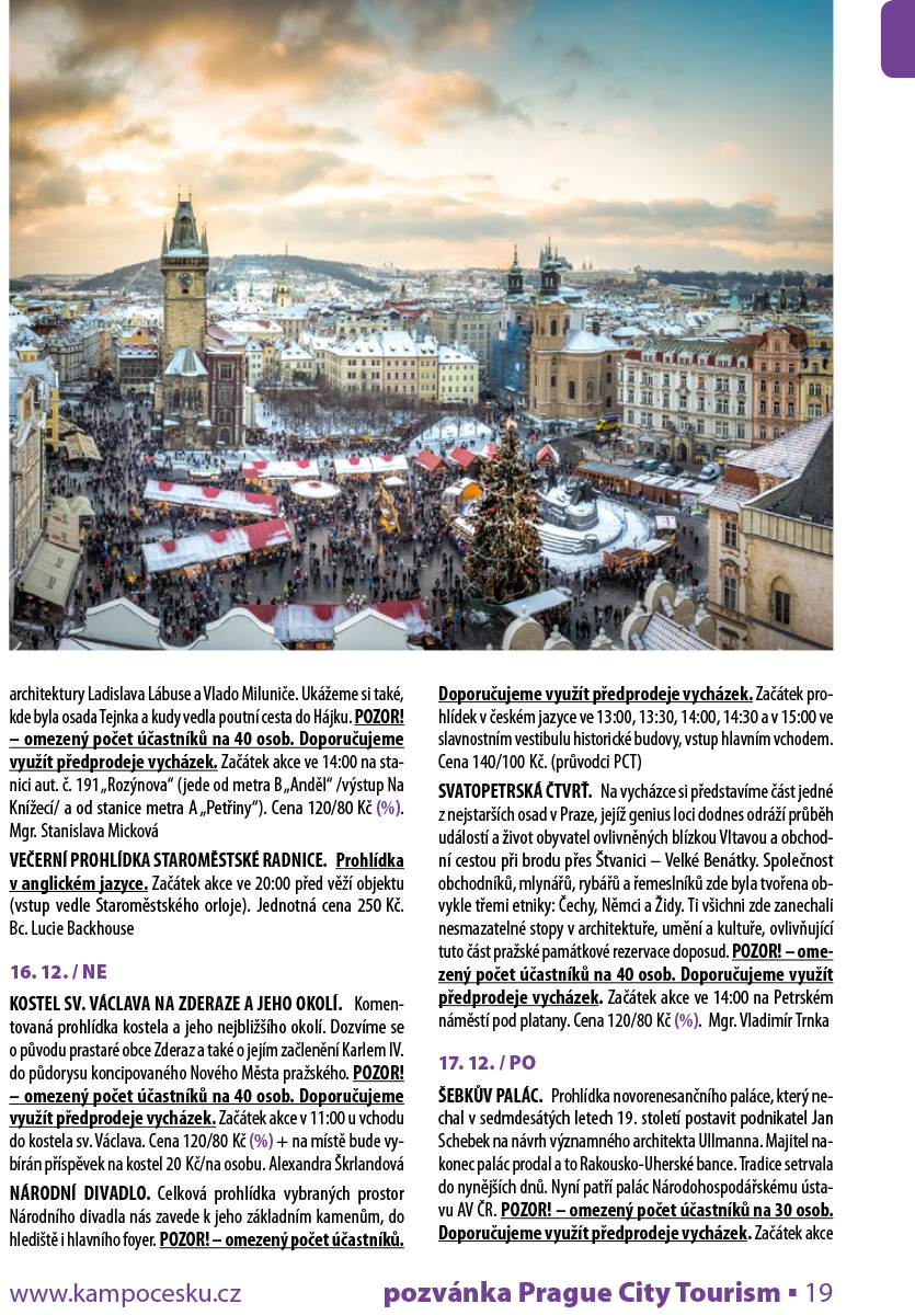 OD PRAŽSKÉHO JEZULÁTKA NA KAMPU. Pojďte s námi v adventním čase navštívit pražské Jezulátko! Najdeme ho v kostele Panny Marie Vítězné a sv. Antonína Paduánského, v raně barokním chrámu s hodnotným mobiliářem. Pokud nám to situace dovolí, podíváme se také do běžně nepřístupné krypty. Po prohlídce kostela se vydáme směrem na Kampu, která návštěvníky okouzluje svou atmosférou i v zimním čase. POZOR! – omezený počet účastníků na 30 osob. Doporučujeme využít předprodeje vycházek. Začátek akce v 15:00 před vchodem do kostela (ul. Karmelitská, nejbližší zastávka tram. č. 12, 20 „Hellichova“). Cena 120/80 Kč. Pavla Lešovská