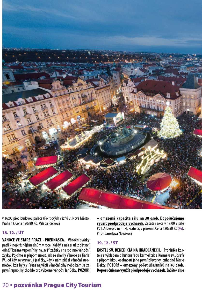 VÁNOCE VE STARÉ PRAZE - PŘEDNÁŠKA. Vánoční svátky patří k nejkrásnějším dnům v roce. Každý z nás si už z dětství odnáší krásné vzpomínky na „své“ zážitky i na rodinné vánoční zvyky. Pojďme si připomenout, jak se slavily Vánoce za Karla IV., od kdy se vystavují jesličky, kdy k nám přišel vánoční stromeček, kde byly v Praze největší vánoční trhy nebo kam se za první republiky chodilo pro výborné vánoční lahůdky. POZOR! – omezená kapacita sálu na 30 osob. Doporučujeme využít předprodeje vycházek. Začátek akce v 17:00 v sále PCT, Arbesovo nám. 4, Praha 5, v přízemí. Cena 120/80 Kč (%). PhDr. Jaroslava Nováková