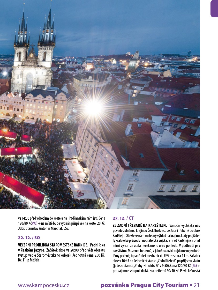 VEČERNÍ PROHLÍDKA STAROMĚSTSKÉ RADNICE. Prohlídka v anglickém jazyce. Začátek akce ve 20:00 před věží objektu (vstup vedle Staroměstského orloje). Jednotná cena 250 Kč. Mgr. Daniel Rejman