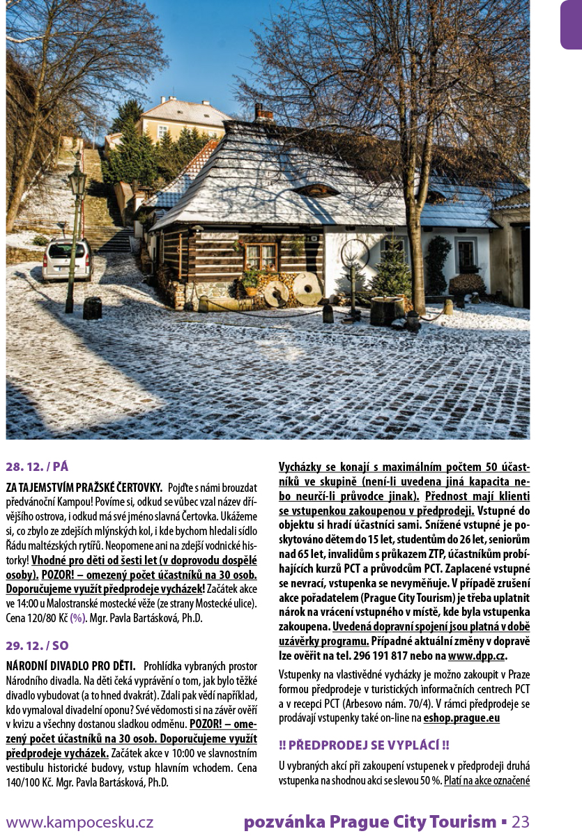 ZA TAJEMSTVÍM PRAŽSKÉ ČERTOVKY. Pojďte s námi brouzdat předvánoční Kampou! Povíme si, odkud se vůbec vzal název dřívějšího ostrova, i odkud má své jméno slavná Čertovka. Ukážeme si, co zbylo ze zdejších mlýnských kol, i kde bychom hledali sídlo Řádu maltézských rytířů. Neopomene ani na zdejší vodnické historky! Vhodné pro děti od šesti let (v doprovodu dospělé osoby). POZOR! – omezený počet účastníků na 30 osob. Doporučujeme využít předprodeje vycházek! Začátek akce ve 14:00 u Malostranské mostecké věže (ze strany Mostecké ulice). Cena 120/80 Kč (%). Mgr. Pavla Bartásková, Ph.D.