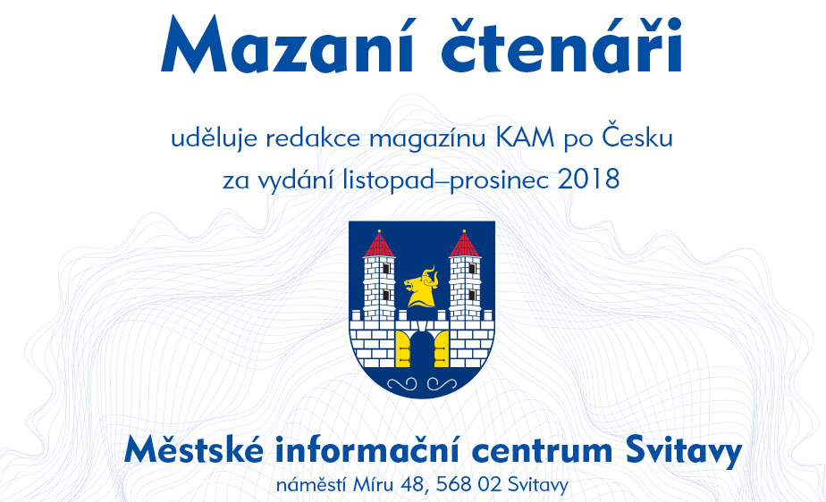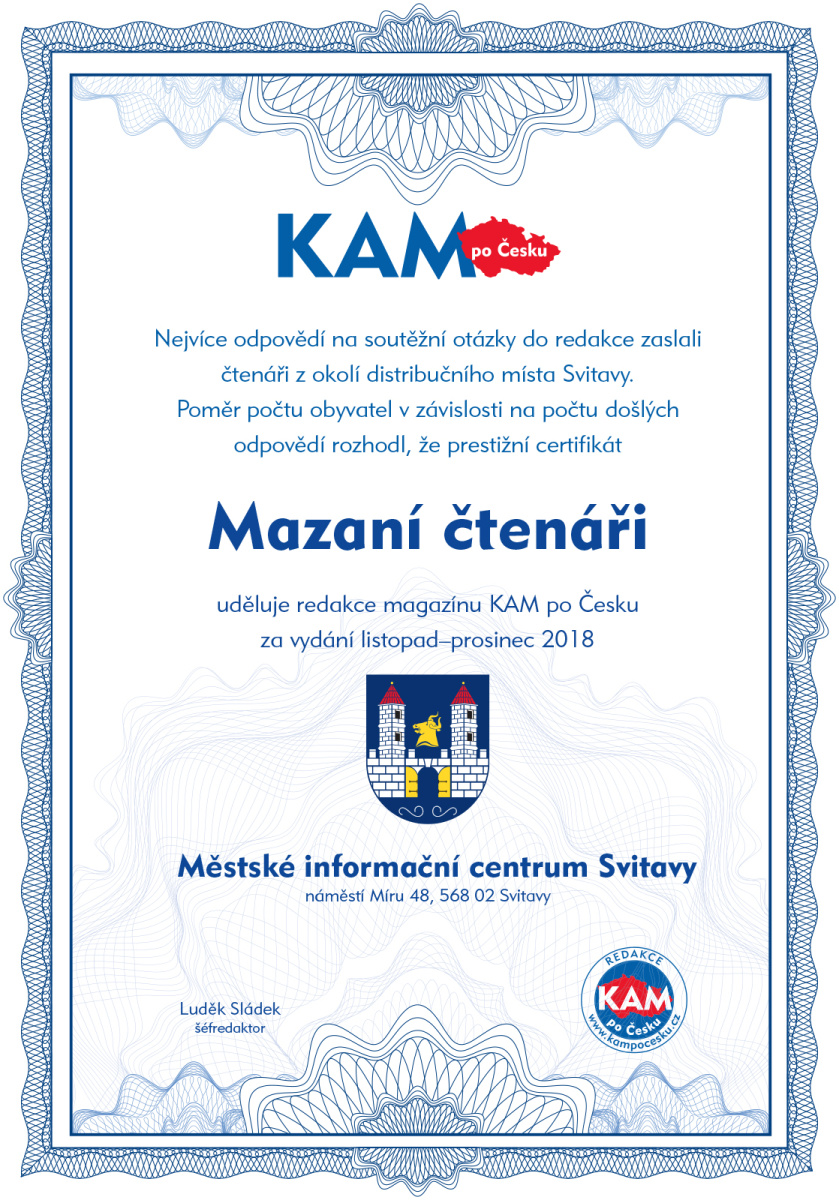 Nejvíce odpovědí na soutěžní otázky do redakce zaslali čtenáři z okolí distribučního místa Svitavy. Poměr počtu obyvatel v závislosti na počtu došlých odpovědí rozhodl, že prestižní certifikát Mazaní čtenáři uděluje redakce magazínu KAM po Česku za vydání listopad–prosinec 2018 Městské informační centrum Svitavy, náměstí Míru 48, 568 02 Svitavy