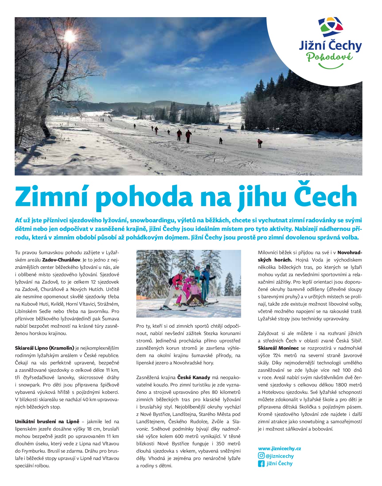 Tu pravou šumavskou pohodu zažijete v Lyžařském areálu Zadov-Churáňov. Je to jedno z nejznámějších center běžeckého lyžování u nás, ale i oblíbené místo sjezdového lyžování. Sjezdové lyžování na Zadově, to je celkem 12 sjezdovek na Zadově, Churáňově a Nových Hutích. Určitě ale nesmíme opomenout skvělé sjezdovky třeba na Kubově Huti, Kvildě, Horní Vltavici, Strážném, Libínském Sedle nebo třeba na Javorníku. Pro příznivce běžkového lyžovánJedinčí pak Šumava nabízí bezpočet možností na krásné túry zasněženou horskou krajinou.