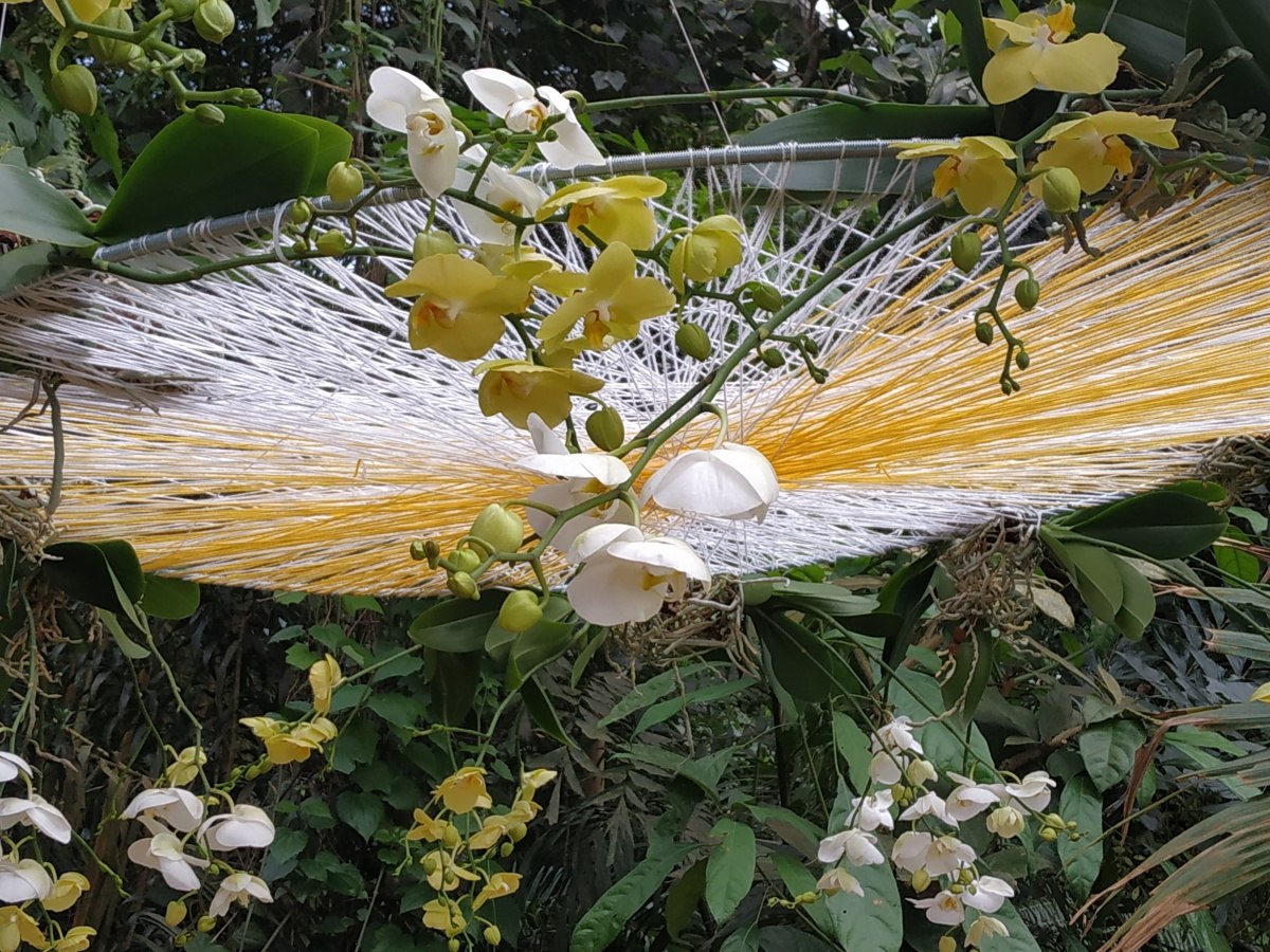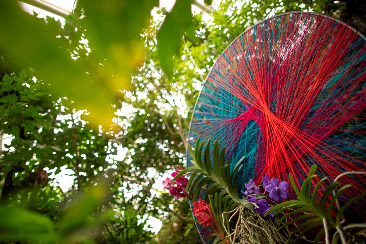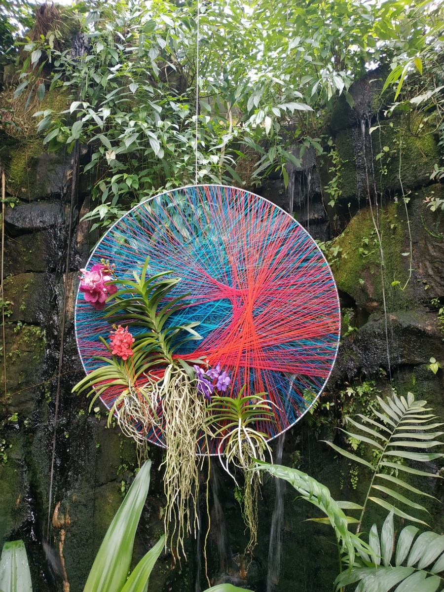 Ztvárnění od floristky Kláry Franc Vavříkové je skutečně unikátní. V prostoru skleníku se nachází nespočet kruhů omotaných pestrými vlákny, v nichž jsou propleteny orchideje a to často tak, aby byly co nejvíce barevně slazeny. A to dokonce i do modra. Kdo by si ale myslel, že jsou ony mysticky působící modré orchideje barvené, mýlil by se. Jedná se o exkluzivní orchideje rodu Vanda, která vykvétá v různých odstínech modré a fialové barvy.