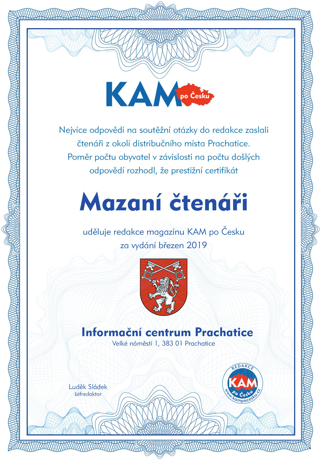 Nejvíce odpovědí na soutěžní otázky do redakce zaslali čtenáři z okolí distribučního místa Prachatice. Poměr počtu obyvatel v závislosti na počtu došlých odpovědí rozhodl, že prestižní certifi kát Mazaní čtenáři uděluje redakce magazínu KAM po Česku za vydání březen 2019 Informační centrum Prachatice Velké náměstí 1, 383 01 Prachatice