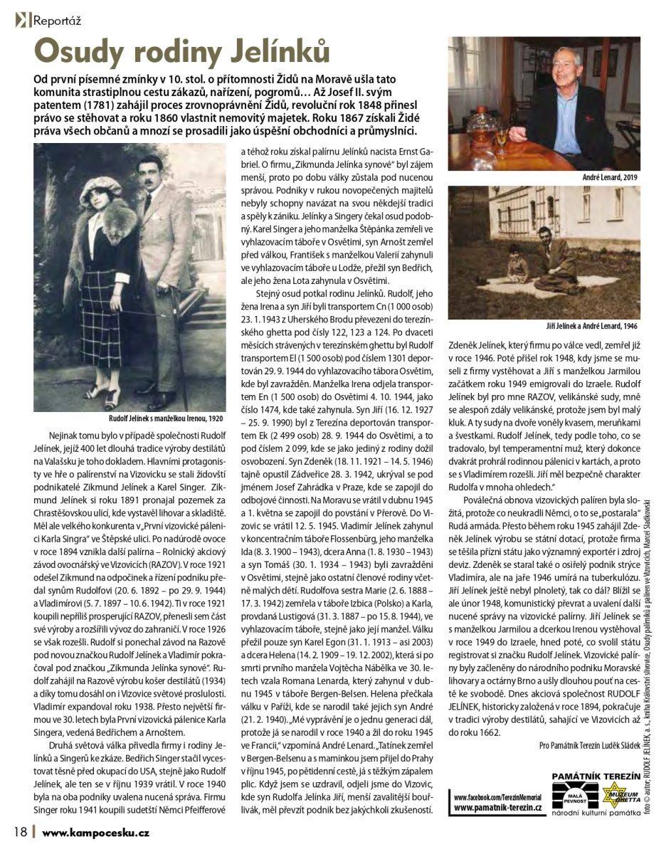 Stejný osud potkal rodinu Jelínků. Rudolf, jeho žena Irena a syn Jiří byli transportem Cn (1 000 osob) 23. 1. 1943 z Uherského Brodu převezeni do terezínského ghetta pod čísly 122, 123 a 124. Po dvaceti měsících strávených v terezínském ghettu byl Rudolf transportem El (1 500 osob) pod číslem 1301 deportován 29. 9. 1944 do vyhlazovacího tábora Osvětim, kde byl zavražděn. Manželka Irena odjela transportem En (1 500 osob) do Osvětimi 4. 10. 1944, jako číslo 1474, kde také zahynula. Syn Jiří (16. 12. 1927 – 25. 9. 1990) byl z Terezína deportován transportem Ek (2 499 osob) 28. 9. 1944 do Osvětimi, a to pod číslem 2 099, kde se jako jediný z rodiny dožil osvobození. Syn Zdeněk (18. 11. 1921 – 14. 5. 1946) tajně opustil Zádveřice 28. 3. 1942, ukrýval se pod jménem Josef Zahrádka v Praze, kde se zapojil do odbojové činnosti. Na Moravu se vrátil v dubnu 1945 a 1. května se zapojil do povstání v Přerově. Do Vizovic se vrátil 12. 5. 1945. Vladimír Jelínek zahynul v koncentračním táboře Flossenbürg, jeho manželka Ida (8. 3. 1900 – 1943), dcera Anna (1. 8. 1930 – 1943) a syn Tomáš (30. 1. 1934 – 1943) byli zavražděni v Osvětimi, stejně jako ostatní členové rodiny včetně malých dětí. Rudolfova sestra Marie (2. 6. 1888 – 17. 3. 1942) zemřela v táboře Izbica (Polsko) a Karla, provdaná Lustigová (31. 3. 1887 – po 15. 8. 1944), ve vyhlazovacím táboře, stejně jako její manžel. Válku přežil pouze syn Karel Egon (31. 1. 1913 – asi 2003) a dcera Helena (14. 2. 1909 – 19. 12. 2002), která si po smrti prvního manžela Vojtěcha Nábělka ve 30. letech vzala Romana Lenarda, který zahynul v dubnu 1945 v táboře Bergen-Belsen. Helena přečkala válku v Paříži, kde se narodil také jejich syn André (21. 2. 1940). „Mé vyprávění je o jednu generaci dál, protože já se narodil v roce 1940 a žil do roku 1945 ve Francii,“ vzpomíná André Lenard. „Tatínek zemřel v Bergen-Belsenu a s maminkou jsem přijel do Prahy v říjnu 1945, po pětidenní cestě, já s těžkým zápalem plic. Když jsem se uzdravil, odjeli jsme do Vizovic, kde syn Rudolfa Jelínka Jiří, menší zavalitější bouřlivák, měl převzít podnik bez jakýchkoli zkušeností. Zdeněk Jelínek, který firmu po válce vedl, zemřel již v roce 1946. Poté přišel rok 1948, kdy jsme se museli z firmy vystěhovat a Jiří s manželkou Jarmilou začátkem roku 1949 emigrovali do Izraele. Rudolf Jelínek byl pro mne RAZOV, velikánské sudy, mně se alespoň zdály velikánské, protože jsem byl malý kluk. A ty sudy na dvoře voněly kvasem, meruňkami a švestkami. Rudolf Jelínek, tedy podle toho, co se tradovalo, byl temperamentní muž, který dokonce dvakrát prohrál rodinnou pálenici v kartách, a proto se s Vladimírem rozešli. Jiří měl bezpečně charakter Rudolfa v mnoha ohledech.“