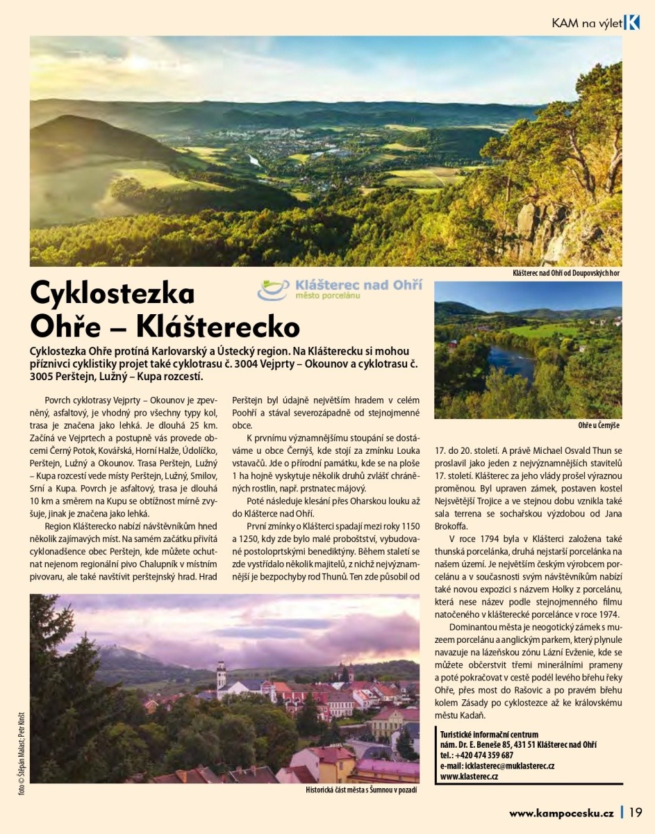 Dominantou města je neogotický zámek s muzeem porcelánu a anglickým parkem, který plynule navazuje na lázeňskou zónu Lázní Evženie, kde se můžete občerstvit třemi minerálními prameny a poté pokračovat v cestě podél levého břehu řeky Ohře, přes most do Rašovic a po pravém břehu kolem Zásady po cyklostezce až ke královskému městu Kadaň.