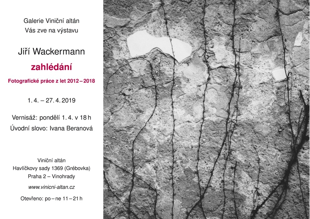 Výstavu Jiřího Wackermana s názvem Zahlédání můžete od 1. dubna do 27. dubna shlédnout v galerii Viniční altán. Své fotografické obrazy charakterizuje Jiří Wackermann jako „nálezy a zprávy z území mezi fakticitou a fantazií.“ Ve své tvorbě navazuje na východiska a podněty z formativních let jeho mládí – patrné jsou vlivy surrealismu a magického realismu – necítí se ale vázán žádnou programovou pozicí, pohybuje se volně mezi optickou lyrikou a brutálním informelem, mezi předmětností a abstrakcí. Jak ale tyto obrazy vznikají – a o čem vypovídají?