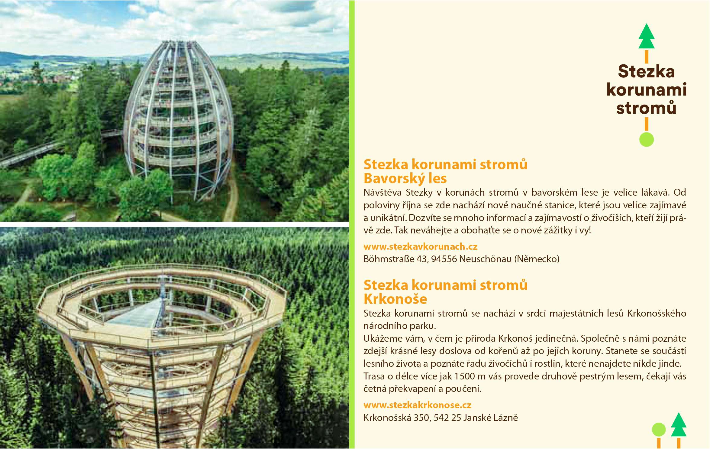 Stezka korunami stromů se nachází v srdci majestátních lesů Krkonošského národního parku. Ukážeme vám, v čem je příroda Krkonoš jedinečná. Společně s námi poznáte zdejší krásné lesy doslova od kořenů až po jejich koruny. Stanete se součástí lesního života a poznáte řadu živočichů i rostlin, které nenajdete nikde jinde. Trasa o délce více jak 1500 m vás provede druhově pestrým lesem, čekají vás četná překvapení a poučení.