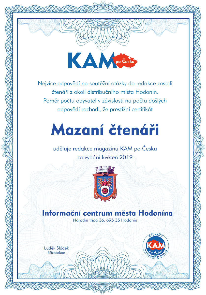 Nejvíce odpovědí na soutěžní otázky do redakce zaslali čtenáři z okolí distribučního místa Hodonín. Poměr počtu obyvatel v závislosti na počtu došlých odpovědí rozhodl, že prestižní certifikát Mazaní čtenáři uděluje redakce magazínu KAM po Česku za vydání květen 2019 Informační centrum města Hodonína, Národní třída 36, 695 35 Hodonín