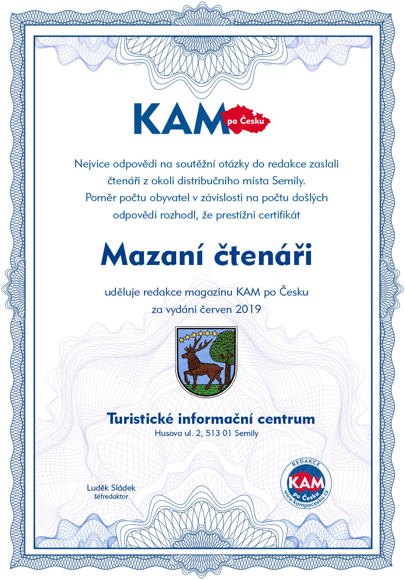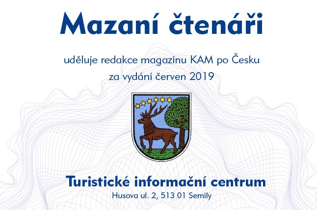 Poměr počtu obyvatel v závislosti na počtu došlých odpovědí rozhodl, že prestižní certifikát Mazaní čtenáři uděluje redakce magazínu KAM po Česku za vydání červen 2019 Turistické informační centrum Husova ul. 2, 513 01 Semily