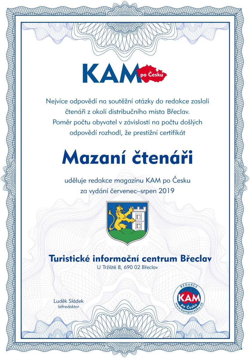 Poměr počtu obyvatel v závislosti na počtu došlých odpovědí rozhodl, že prestižní certifikát Mazaní čtenáři uděluje redakce magazínu KAM po Česku za vydání červenec–srpen 2019