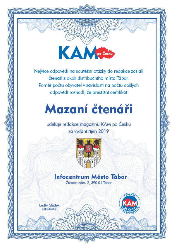 Nejvíce odpovědí na soutěžní otázky do redakce zaslali čtenáři z okolí distribučního místa Tábor. Poměr počtu obyvatel v závislosti na počtu došlých odpovědí rozhodl, že prestižní certifikát Mazaní čtenáři uděluje redakce magazínu KAM po Česku za vydání říjen 2019