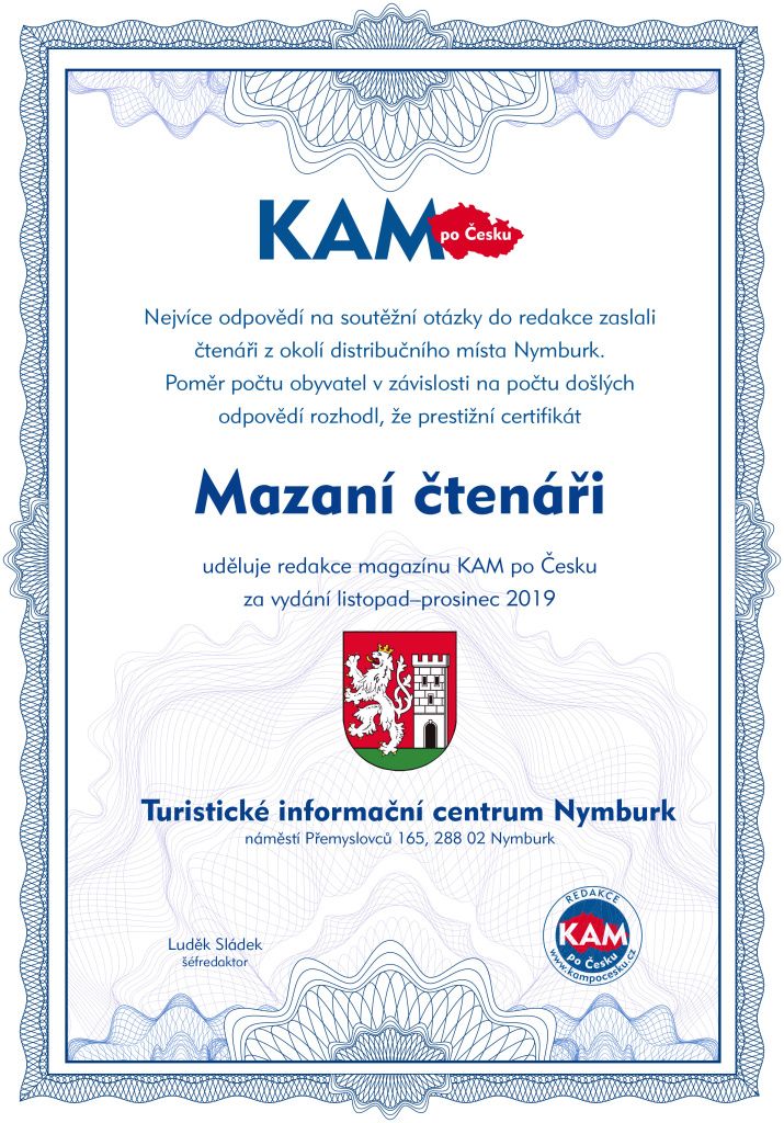 Nejvíce odpovědí na soutěžní otázky do redakce zaslali čtenáři z okolí distribučního místa Nymburk. Poměr počtu obyvatel v závislosti na počtu došlých odpovědí rozhodl, že prestižní certifikát Mazaní čtenáři uděluje redakce magazínu KAM po Česku za vydání listopad–prosinec 2019 Turistické informační centrum Nymburk náměstí Přemyslovců 165, 288 02 Nymburk