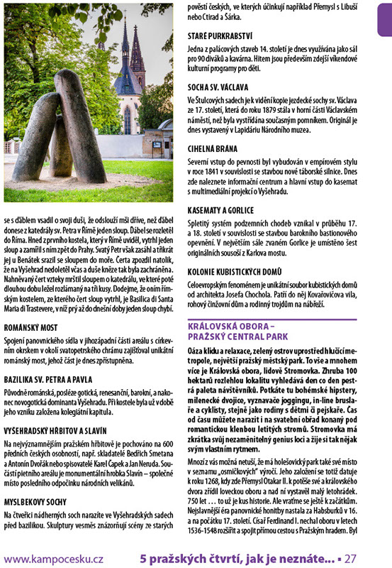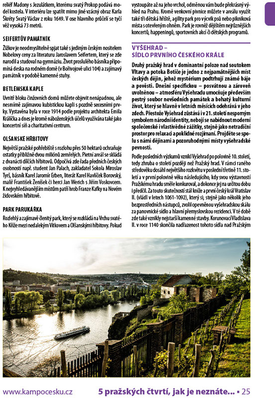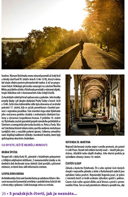 Druhý pražský hrad v dominantní poloze nad soutokem Vltavy a potoka Botiče je jedno z nejpamátnějších míst českých dějin, jehož mystérium podtrhují známé báje a pověsti. Dnešní specifickou – posvátnou a zároveň uvolněnou – atmosféru Vyšehradu umocňuje především pestrý soubor nevšedních památek a bohatý kulturní život, který se hlavně v letních měsících odehrává v jeho zdech. Přestože Vyšehrad zůstává i v 21. století nesporným symbolem národní identity, nebojí se nabídnout moderní společenské i vlastivědné zážitky, stejně jako netradiční prostor pro relaxaci a poklidné rozjímaní. Projděte se spolu s námi dějinami a pozoruhodnými místy vyšehradské pevnosti.