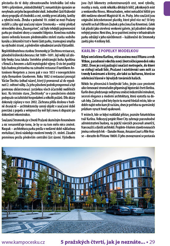 Kdysi omšelému Karlínu, vtěsnanému mezi Vltavu a vrch Vítkov, paradoxně vdechla nový život ničivá povodeň roku 2002. Dnes je z něj pulzující součást metropole, do které se stěhují mladí lidé, Pražané i návštěvníci sem míří za trendy kavárnami a bistry, ale také za kulturou, která se odehrává hlavně v bývalých továrních halách.
