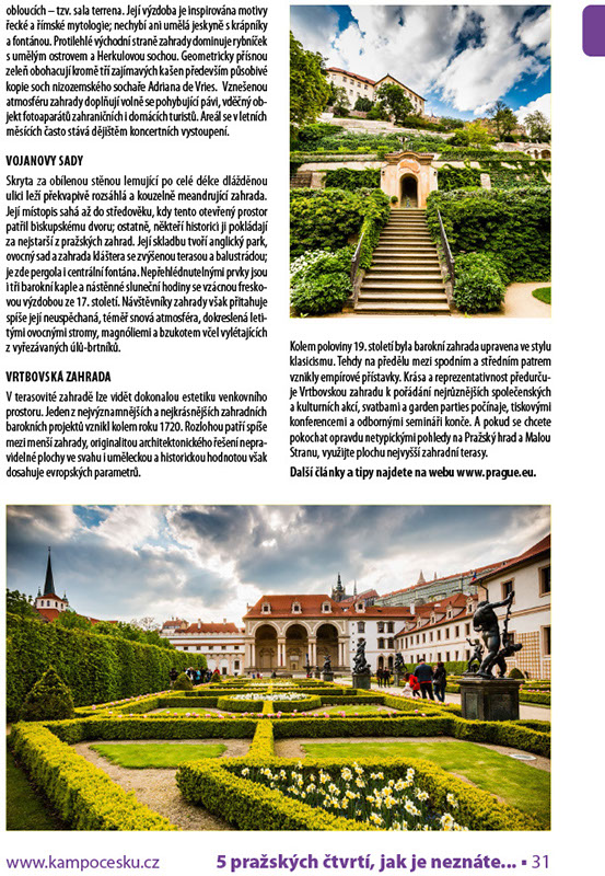 Ne každý si při procházce historickým centrem Prahy uvědomí, kolik překvapivě rozsáhlých zelených ploch ukrývá zdánlivě nevelká Malá Strana. Zdejší zahrady dokonale zakomponované do jedinečných architektonických kulis přitom zásadně promlouvají do celkové atmosféry „města pod Hradem“ a jsou ideálními odpočinkovými zónami na dohled od nejfrekventovanějších turistických tras. Zde jsou čtyři nejkrásnější: