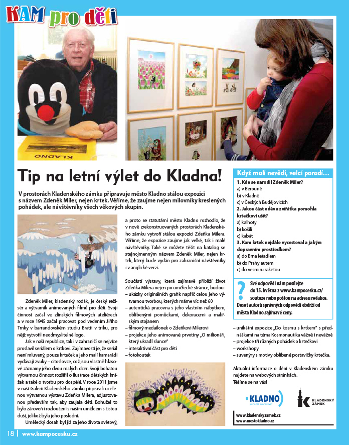 Umělecký dosah byl již za jeho života světový, a proto se statutární město Kladno rozhodlo, že v nově zrekonstruovaných prostorách Kladenského zámku vytvoří stálou expozici Zdeňka Milera. Věříme, že expozice zaujme jak velké, tak i malé návštěvníky. Také se můžete těšit na katalog se stejnojmenným názvem Zdeněk Miler, nejen krtek, který bude vydán pro zahraniční návštěvníky i v anglické verzi.