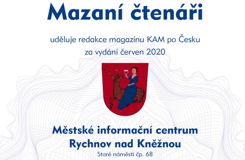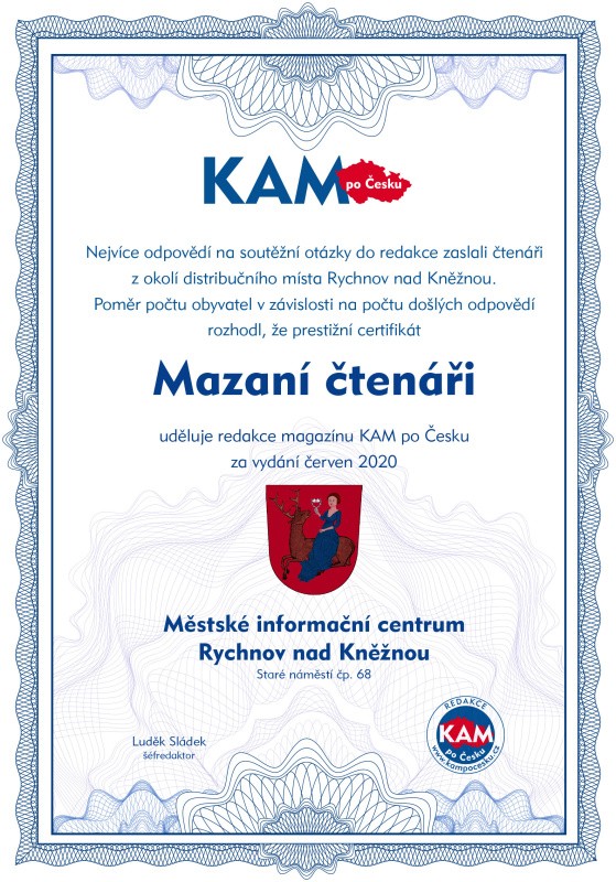 Poměr počtu obyvatel v závislosti na počtu došlých odpovědí rozhodl, že prestižní certifikát Mazaní čtenáři uděluje redakce magazínu KAM po Česku za vydání červen 2020 Městské informační centrum Rychnov nad Kněžnou Staré náměstí čp. 68