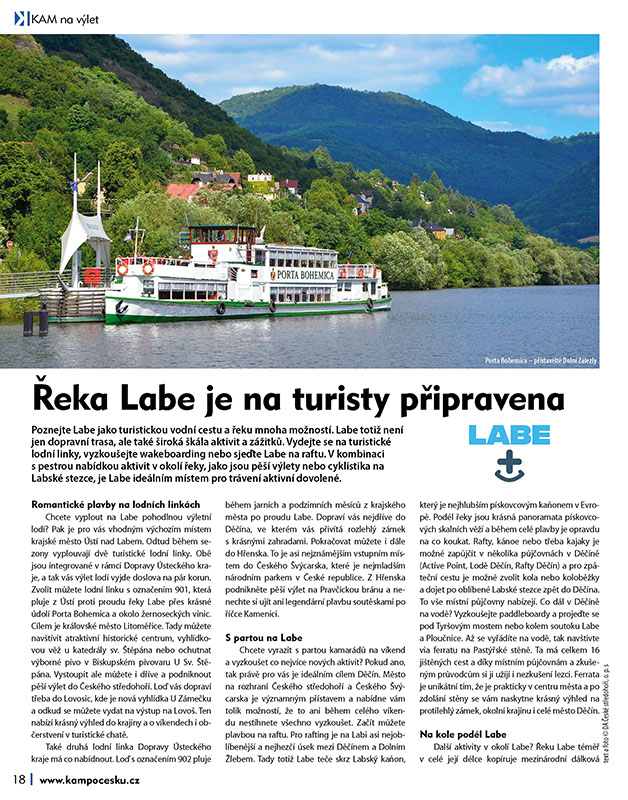 Chcete vyplout na Labe pohodlnou výletní lodí? Pak je pro vás vhodným výchozím místem krajské město Ústí nad Labem. Odtud během sezony vyplouvají dvě turistické lodní linky. Obě jsou integrované v rámci Dopravy Ústeckého kraje, a tak vás výlet lodí vyjde doslova na pár korun. Zvolit můžete lodní linku s označením 901, která pluje z Ústí proti proudu řeky Labe přes krásné údolí Porta Bohemica a okolo žernoseckých vinic. Cílem je královské město Litoměřice. Tady můžete navštívit atraktivní historické centrum, vyhlídkovou věž u katedrály sv. Štěpána nebo ochutnat výborné pivo v Biskupském pivovaru U Sv. Štěpána. Vystoupit ale můžete i dříve a podniknout pěší výlet do Českého středohoří. Loď vás dopraví třeba do Lovosic, kde je nová vyhlídka U Zámečku a odkud se můžete vydat na výstup na Lovoš. Ten nabízí krásný výhled do krajiny a o víkendech i občerstvení v turistické chatě.