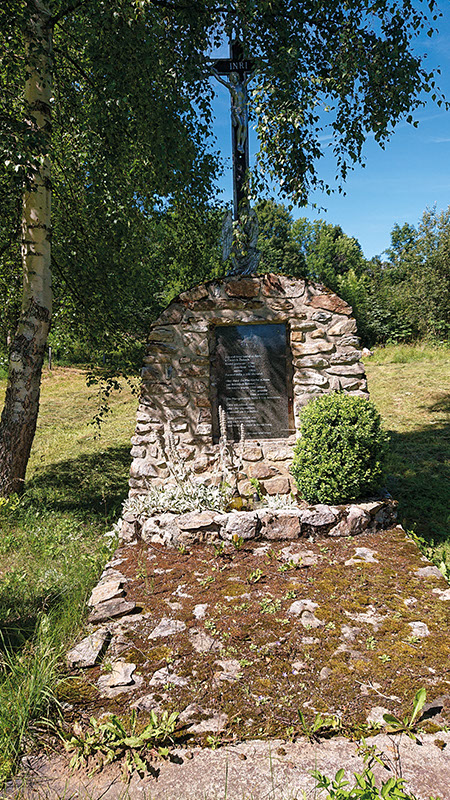 Symbolický náhrobek z kamenů s deskou z mramoru a křížem v Českých Žlebech u Stožce je věnován zničenému farnímu kostelu sv. Anny.