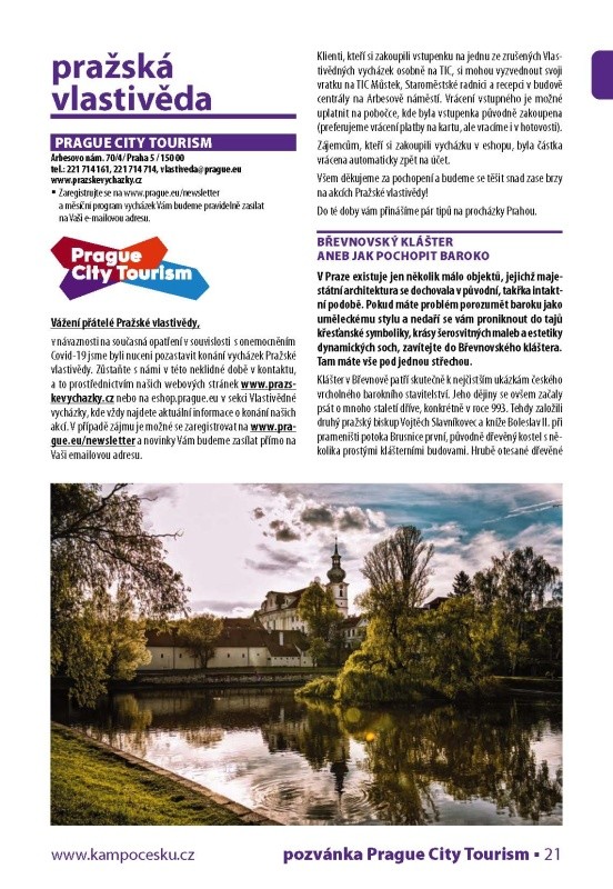 v návaznosti na současná opatření v souvislosti s onemocněním Covid-19 jsme byli nuceni pozastavit konání vycházek Pražské vlastivědy. Zůstaňte s námi v této neklidné době v kontaktu, a to prostřednictvím našich webových stránek www.prazskevychazky.cz nebo na eshop.prague.eu v sekci Vlastivědné vycházky, kde vždy najdete aktuální informace o konání našich akcí. V případě zájmu je možné se zaregistrovat na www.prague.eu/newsletter a novinky Vám budeme zasílat přímo na Vaši emailovou adresu.