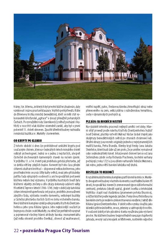Z tohoto období si dnes lze prohlédnout unikátní kryptu pod současným chórem, kterou v šedesátých letech minulého století odkryli archeologové. Jedná se o jednu z nejstarších, alespoň částečně dochovaných kamenných staveb na našem území. V průběhu 13. a 14. století pak probíhala gotická přestavba, jež se dotkla většiny zdejších budov. Konvent byl toho času přední církevní a kulturní institucí – disponoval velkou knihovnou, jeho prostřednictvím se u nás šířily kulty světců, mezi jeho příslušníky patřila řada výrazných osobností a ani hospodářské postavení kláštera nebylo bez významu. V průběhu husitských bouří byly klášterní objekty zničeny a dílo zkázy dokonaly události války třicetileté. Teprve v letech 1708–1745, tedy v době, kdy katolická církev intenzivně upevňovala své pozice, proběhlo znovuoživení zdejšího řádu, výstavba nového konventu, velkolepé baziliky a částečná přestavba starších částí ve slohu vrcholného baroka. Nový klášterní komplex vznikl podle projektu Kryštofa Dientzenhofera a jeho syna Kiliána Ignáce. Jeho nejkrásnější součástí je bezesporu chrám svaté Markéty, na němž lze perfektně rozeznat a pojmenovat všechny hlavní atributy baroka: monumentalitu (jež měla ohromit prostého člověka), citovost až exaltovanost, vnitřní napětí, patos, freskovou klenbu zhmotňující obraz nebe přeneseného na zem, velká plátna s náboženskou tematikou, sochy v dynamických postojích aj.